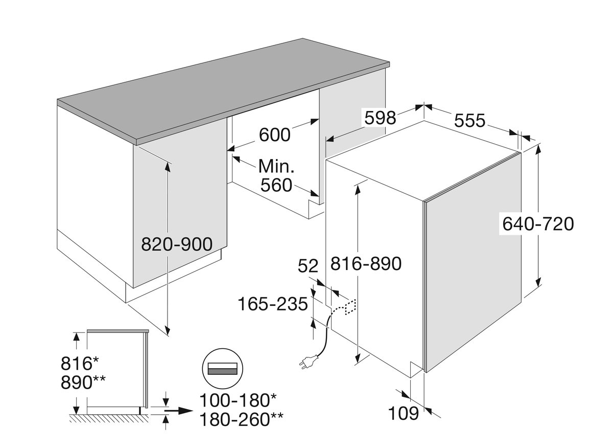 Met een diepte van 56 cm en een inbouwhoogte van 82–90 cm is hij geschikt voor de meeste keukens. Door het relatief lage geluidsniveau (38 dB normaal, 36 dB nachtprogramma) is de machine nauwelijks hoorbaar in open woonkeukens. Het gewicht van het deurpaneel dat gemonteerd kan worden is tussen 3 en 10 kg, wat van belang is bij het plaatsen van een frontpaneel.