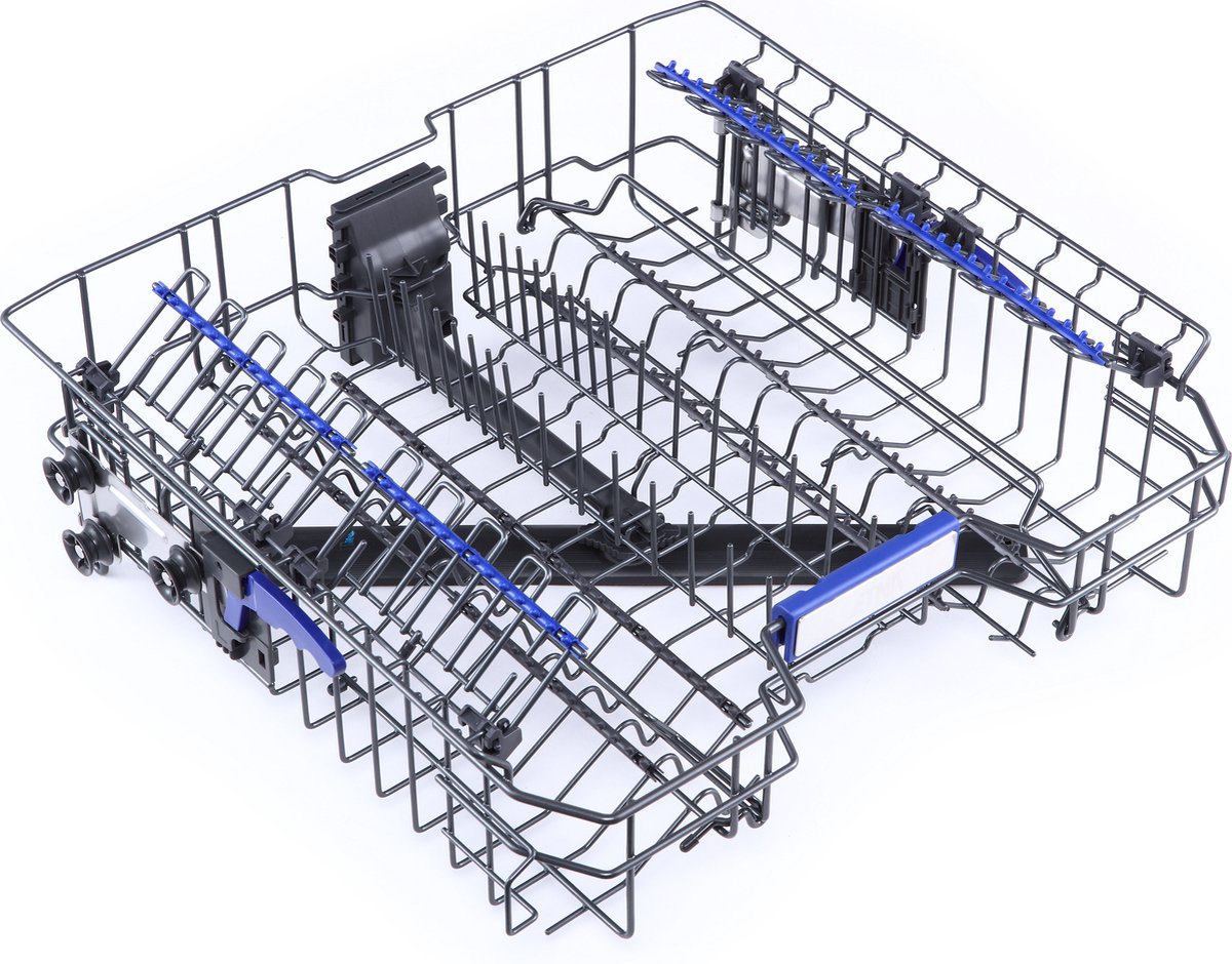 De besteklade is flexibel ontworpen om lepel-, vork- en mesindelingen aan te passen. In de praktijk betekent dit gemakkelijker plaatsen van pannen en schalen in de korven eronder en een nettere wasresultaat doordat bestek gespreid wordt aangeboden.