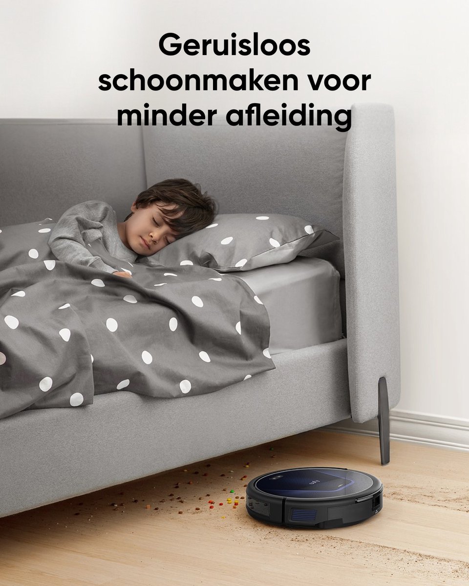 Met circa 55 dB tijdens het schoonmaken (volgens de listing) is de eufy RoboVac G50 Hybrid merkbaar stiller dan veel traditionele stofzuigers en een groot deel van de robotmodellen. Dat voel je in je dagelijkse routine: je kunt bellen, tv kijken of thuiswerken terwijl de robot zijn ronde doet. In gezinnen met jonge kinderen is het fijn dat een middagdutje niet direct verstoord raakt.
