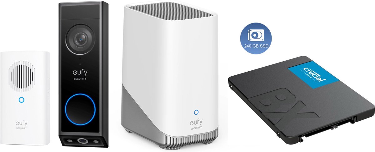 Deze bundelvoordeelset combineert de Eufy video deurbel E340 met twee camera’s, de draadloze deurbelgong (chime), de Eufy HomeBase 3 en een Crucial SSD van 240 GB. Samen vormen ze een complete, privacyvriendelijke slimme beveiligingsoplossing voor je voordeur én je erf, met lokale opslag zonder abonnementskosten en slimme detectie die meldingen relevanter maakt. Je krijgt haarscherp 2K‑beeld, nachtzicht in kleur en pakketbewaking, plus uitbreidbare opslag tot meerdere terabytes via de HomeBase 3.