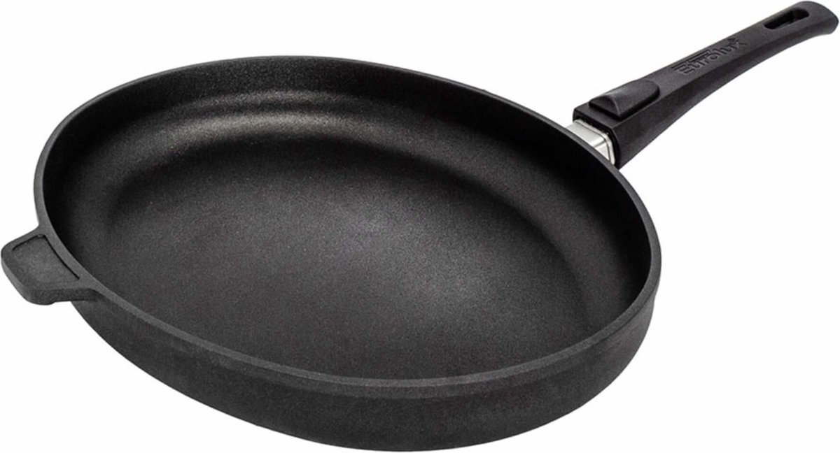 - Door de vorm is de pan bijzonder geschikt voor het bereiden van een hele vis — de breedte en lage rand geven voldoende ruimte en contactoppervlak voor gelijkmatige bereiding.