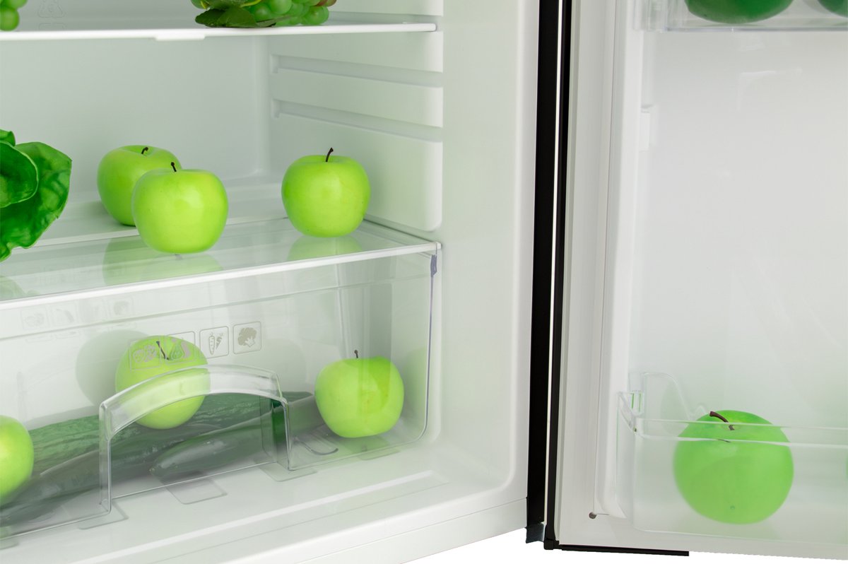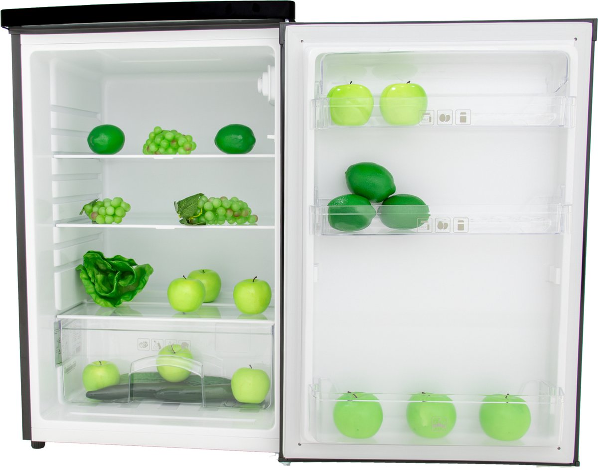 Als tafelmodel koelkast is dit apparaat compact genoeg om onder een werkblad of in een nis te plaatsen, of vrijstaand in een studentenkamer of kantoor. De omkeerbare deurscharnieren helpen om de draairichting te laten aansluiten op jouw keukenopstelling. De binnenzijde is overzichtelijk: drie planken verdelen de ruimte, de drie deurbakken vangen flessen en kleinere verpakkingen op, en onderin houdt de groentelade groente en fruit netjes bij elkaar.