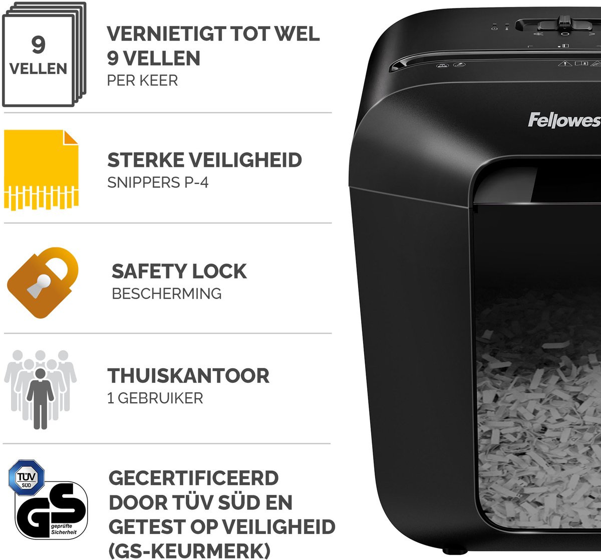 Specificaties: Fellowes LX50 kruissnipperaar (P4, 9 vel, 17L) — korte review