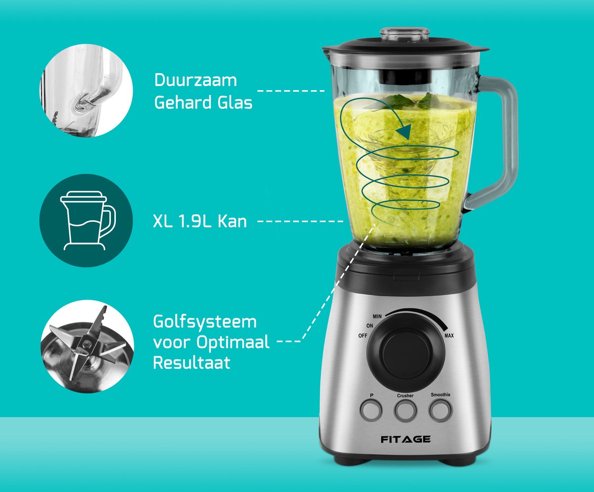 Specificaties: FITAGE Blender Glazen Kan 1.9L review: snelle smoothies, 1200W
