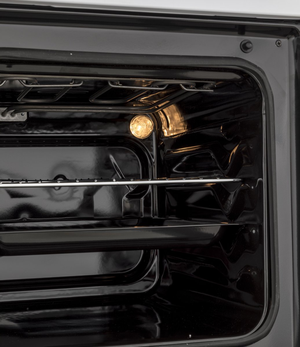 Bediening gebeurt met draaiknoppen aan de voorzijde. Dat is gebruiksvriendelijk: je ziet in één oogopslag welke stand een zone of de oven heeft. Voor wie niet houdt van aanraakbediening of menu’s is dit prettig en intuïtief. De oven heeft binnenverlichting, zodat je gerechten kunt controleren zonder continu de deur te openen en warmte te verliezen.