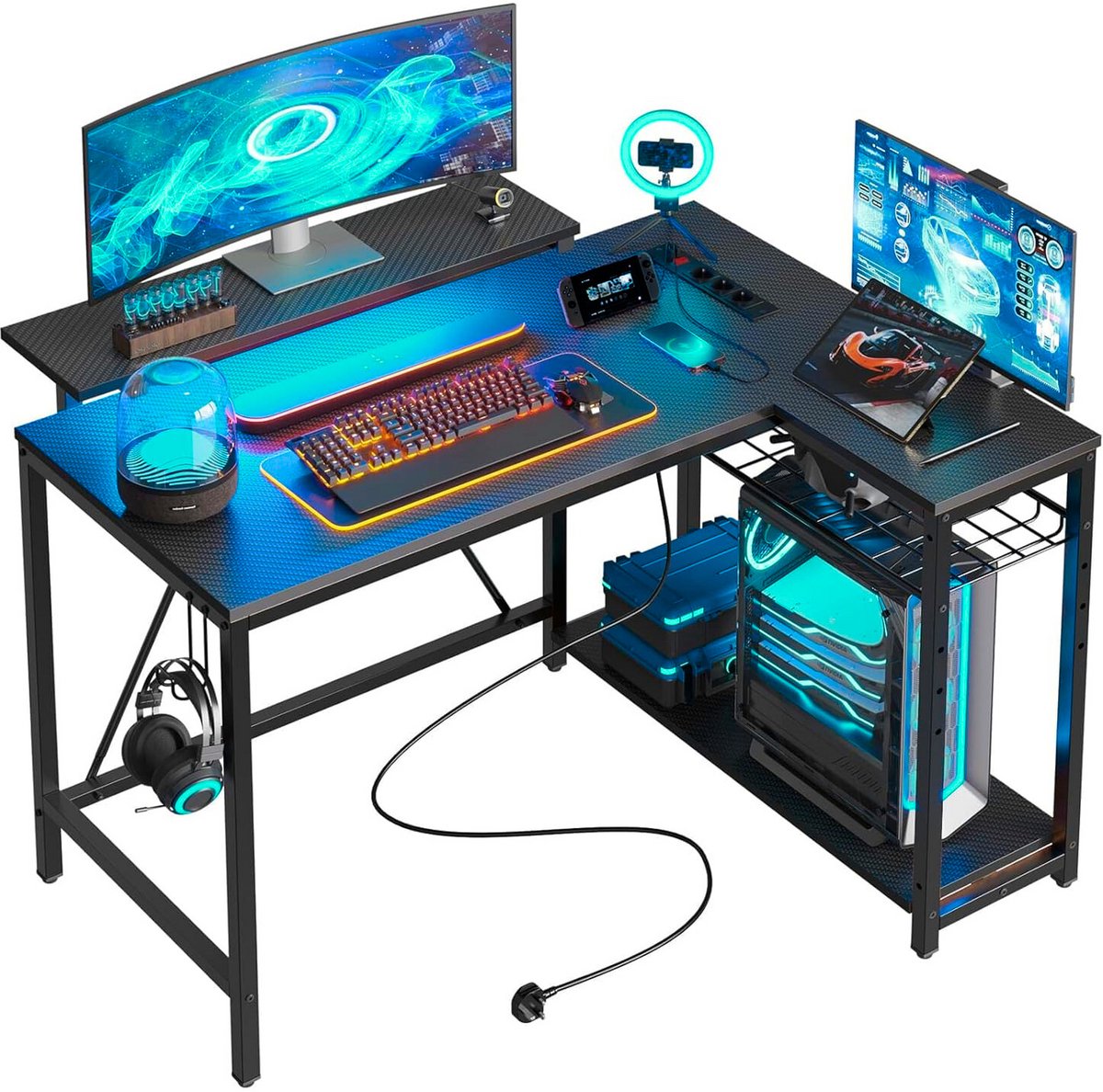 Het Five Stars® L-vormig gaming bureau is een hoekbureau dat gericht is op gamers die ruimte, stevigheid en extra functionaliteit willen combineren. Het bureau heeft een stalen frame, een carbonlook blad en RGB-verlichting onder de monitorstandaard — functies die samen een opgeruimde, visueel sterke game-werkplek opleveren. Dit product richt zich op wie meerdere monitoren, consoles of accessoires wil organiseren zonder concessies te doen aan uitstraling of stabiliteit.