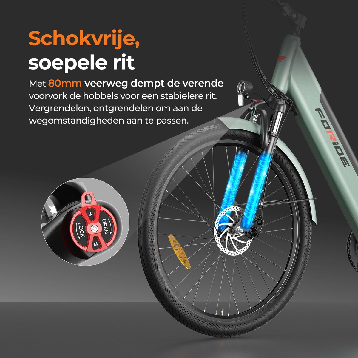 De verende voorvork met 80 mm veerweg neemt scherpe randjes uit klinkers, gaten en drempels. Met de lockout-functie schakel je de vering zo nodig uit op asfalt of bij stevig doortrappen, zodat er minder energieverlies is.
