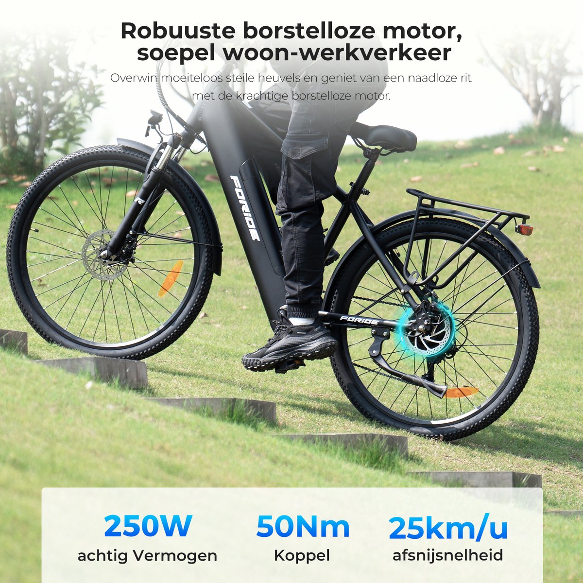 De Foride Roamer 1 elektrische fiets is gebouwd voor zorgeloos woon‑werk en tochten, met een 468 Wh ingebouwde, verwijderbare accu voor ruim bereik. Ideaal voor Nederland: hij voldoet aan de eisen in Nederland en België (afkapsnelheid 25 km/u en 250 W), zodat je conform de regels rijdt.