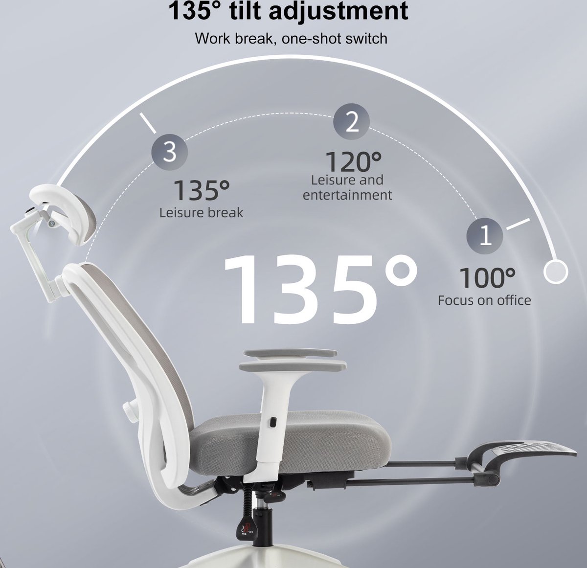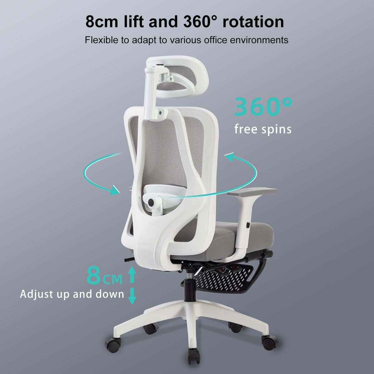 De hoofdsteun van de stoel kan op en neer draaien, waardoor deze zich aanpast aan de bewegingen van je nek. Dit helpt niet alleen om nekpijn te voorkomen, maar zorgt ook voor een ontspannen zithouding.