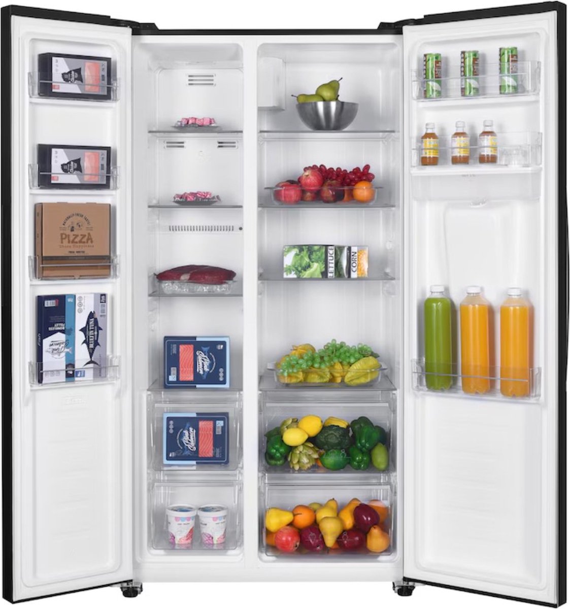 De Fram FSBS-HM440NFBKWDE is vormgegeven als een Amerikaanse koelkast met twee hoge deuren: links doorgaans het vriesdeel, rechts het koeldeel. Dat levert niet alleen een symmetrisch, strak front op, maar ook korte looplijnen in de keuken: je pakt snel wat je nodig hebt, zonder grote deuren te openen. De totale inhoud van 439 liter is ruim genoeg voor de boodschappen van een gezin of gezamenlijke huishouding (bron: listing, gecontroleerd 2025).