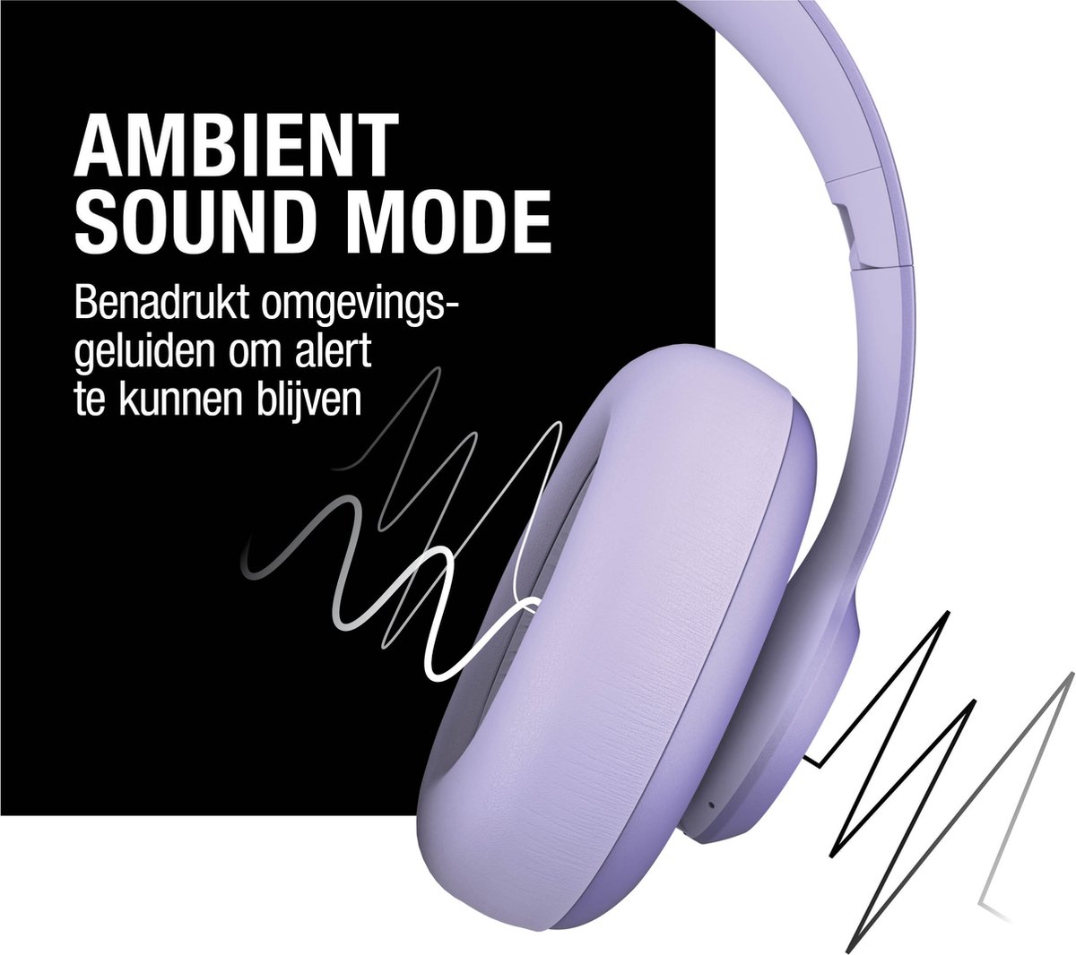 Geluid en ANCDe combinatie van Hybrid ANC en gesloten over-ear oorschelpen levert goede ruisreductie voor laag- en middentonen. Voor het beste resultaat: controleer of de oorkussens goed aansluiten rond je oor en kies de Ambient Mode wanneer je omgevingsgeluid tijdelijk moet horen.