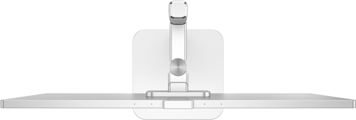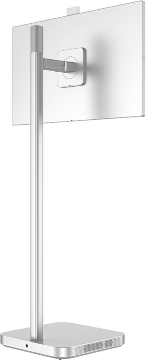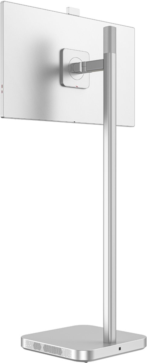 Ergonomie is goed doordacht: de kolom biedt hoogteverstelling tot 20 centimeter, en het scherm kan kantelen, draaien en zelfs pivotsgewijs in portretstand worden gezet. Dat laatste is ideaal voor het lezen van lange documenten, het tonen van staande foto’s of het voeren van videogesprekken waarbij gezichten op natuurlijke grootte in beeld komen. Voor zittend gebruik kun je het scherm lager zetten, en voor presenteren of staand werken zet je het juist hoger.
