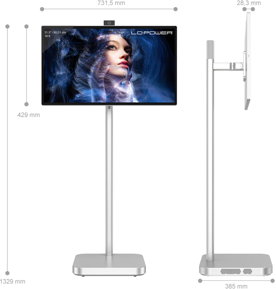 Het materiaal van de behuizing is niet gespecificeerd. Afmetingen en gewicht zijn ook niet vermeld; houd er rekening mee dat een 32 inch opstelling met kolomstandaard en wielen substantieel kan zijn qua plaatsing. De ingebouwde batterij maakt mobiel gebruik mogelijk zonder stopcontact in de buurt; de daadwerkelijke gebruiksduur is niet opgegeven (bron: listing, gecontroleerd 2025).