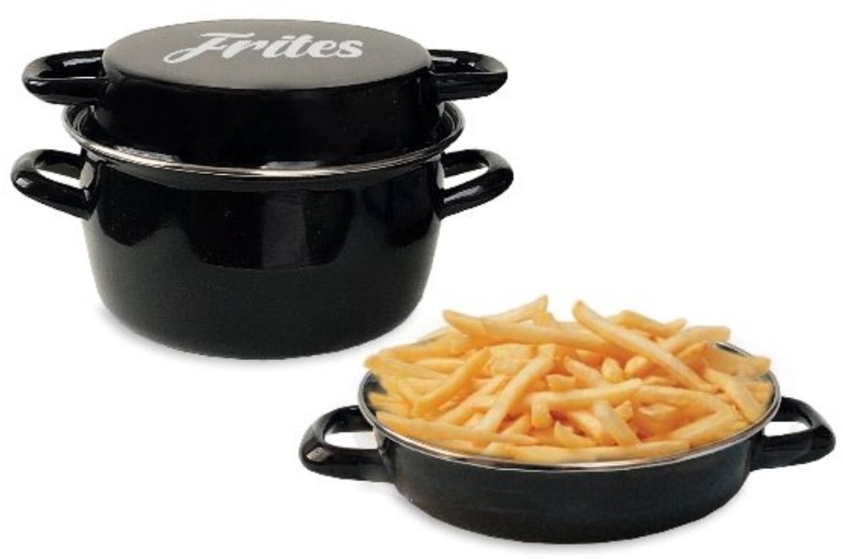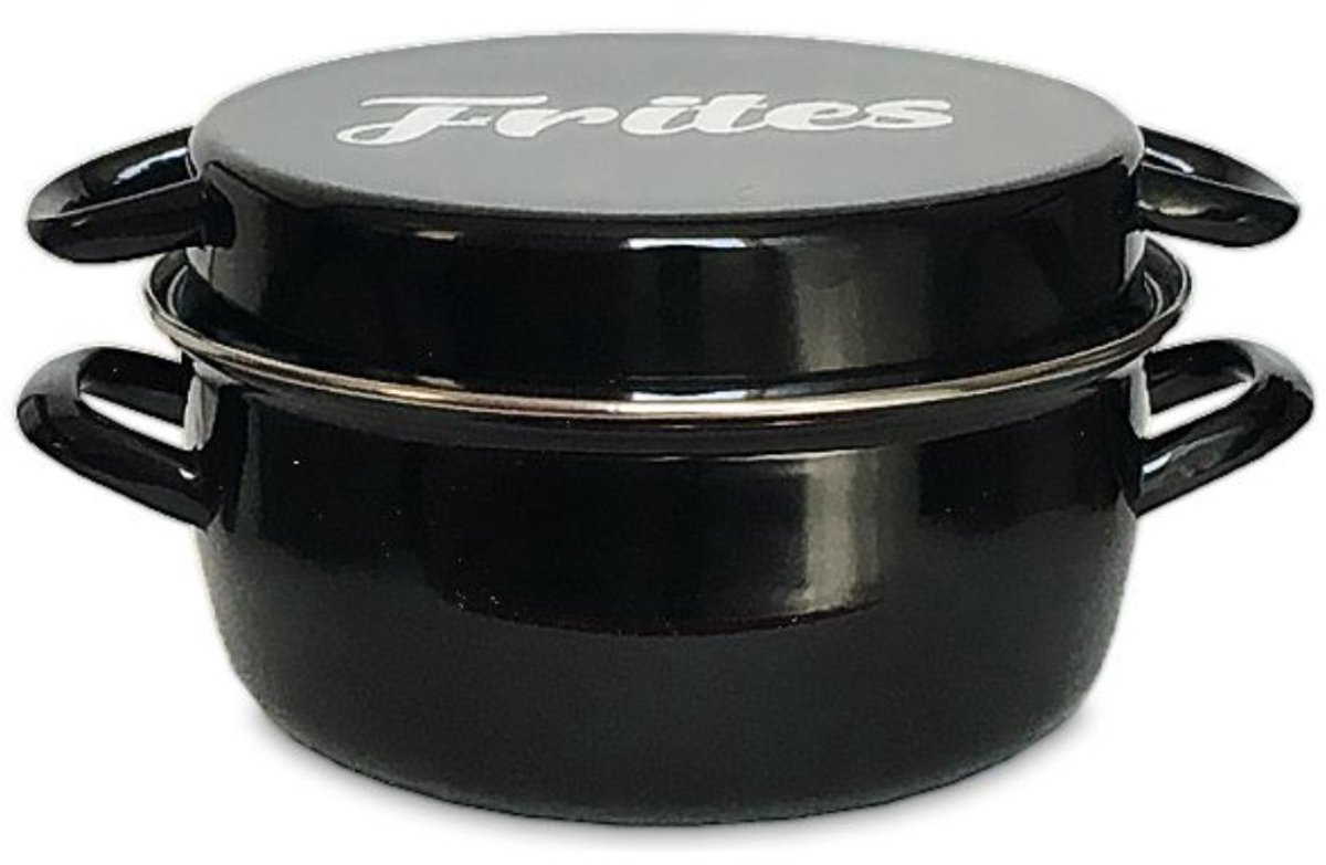 Inclusief Stalen draadmand, glazen deksel, geëmailleerde deksel (serveerschaal), “Frites” opschrift (source: listing, checked 2025)