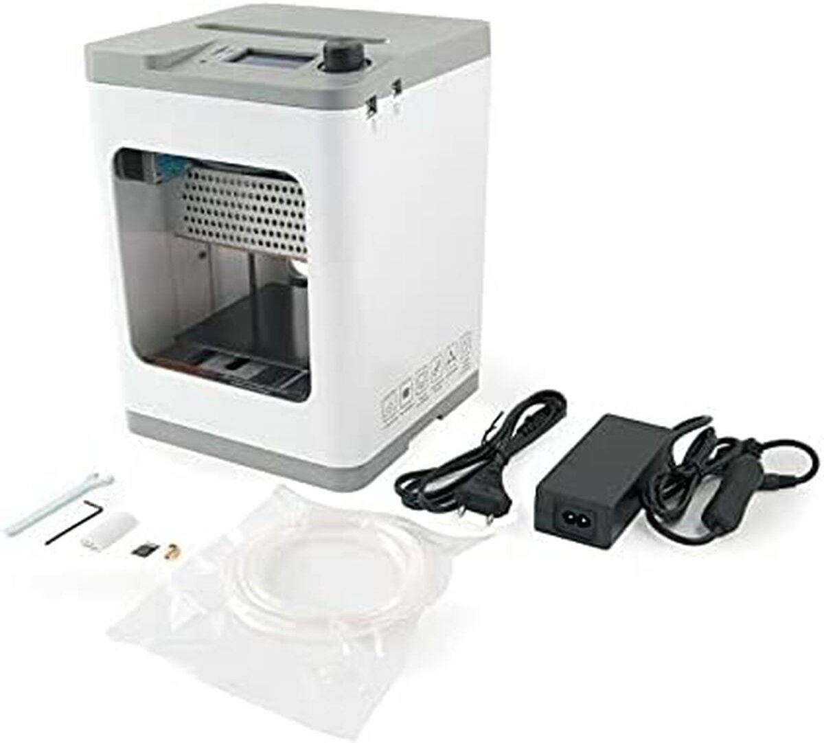 De Gemma is een compacte 3D-printer met een bouwvolume van maximaal 100 x 120 x 100 mm (breedte x diepte x hoogte; bron: listing, geraadpleegd 2025). Dat formaat is ideaal op een bureau, vensterbank of in een klaslokaal met beperkte ruimte. Het kleinere volume heeft ook voordelen: kortere printtijden bij kleine objecten, minder materiaalgebruik en een lagere drempel om te experimenteren met instellingen.