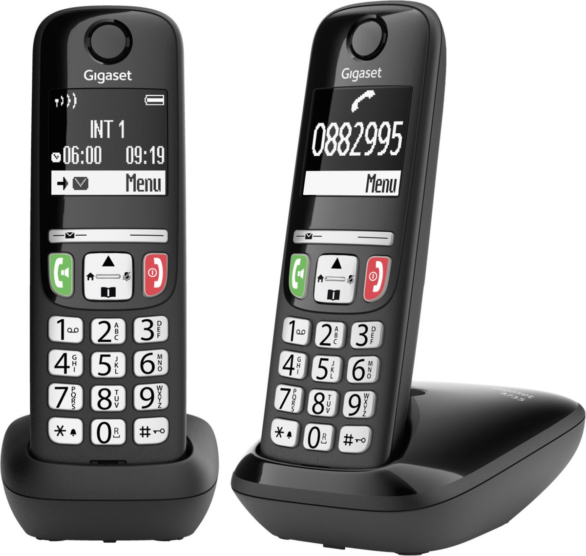 De Gigaset A735 Duo is een duo-set vaste telefoon die bestaat uit twee handsets, zodat er altijd een toestel in de buurt is. De basisgedachte is simpel: een gebruiksvriendelijk toestel met duidelijke knoppen en goede compatibiliteit met hoortoestellen, bedoeld voor huishoudens die een betrouwbaar en gemakkelijk te bedienen telefoonsysteem willen.