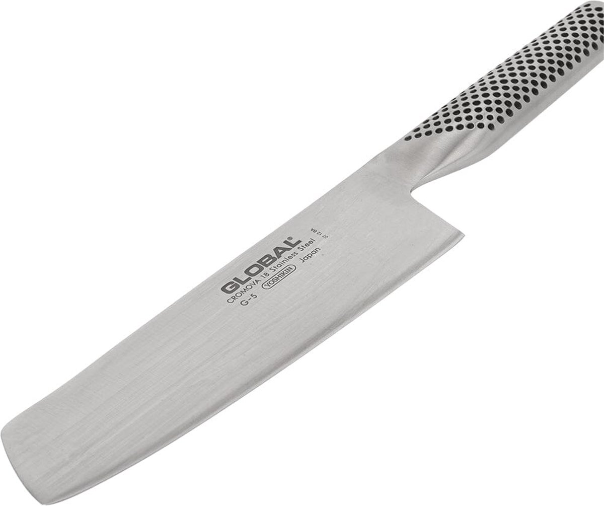 Dit is het G5 Nakirimes 18 cm van Global: een traditioneel Japans groentemes waarmee Nederlandse thuiskoks groente snel en gelijkmatig snijden. Het superdunne, rechthoekige lemmet van 18 cm in CROMOVA 18 roestvrij staal biedt precieze controle voor flinterdunne plakjes.