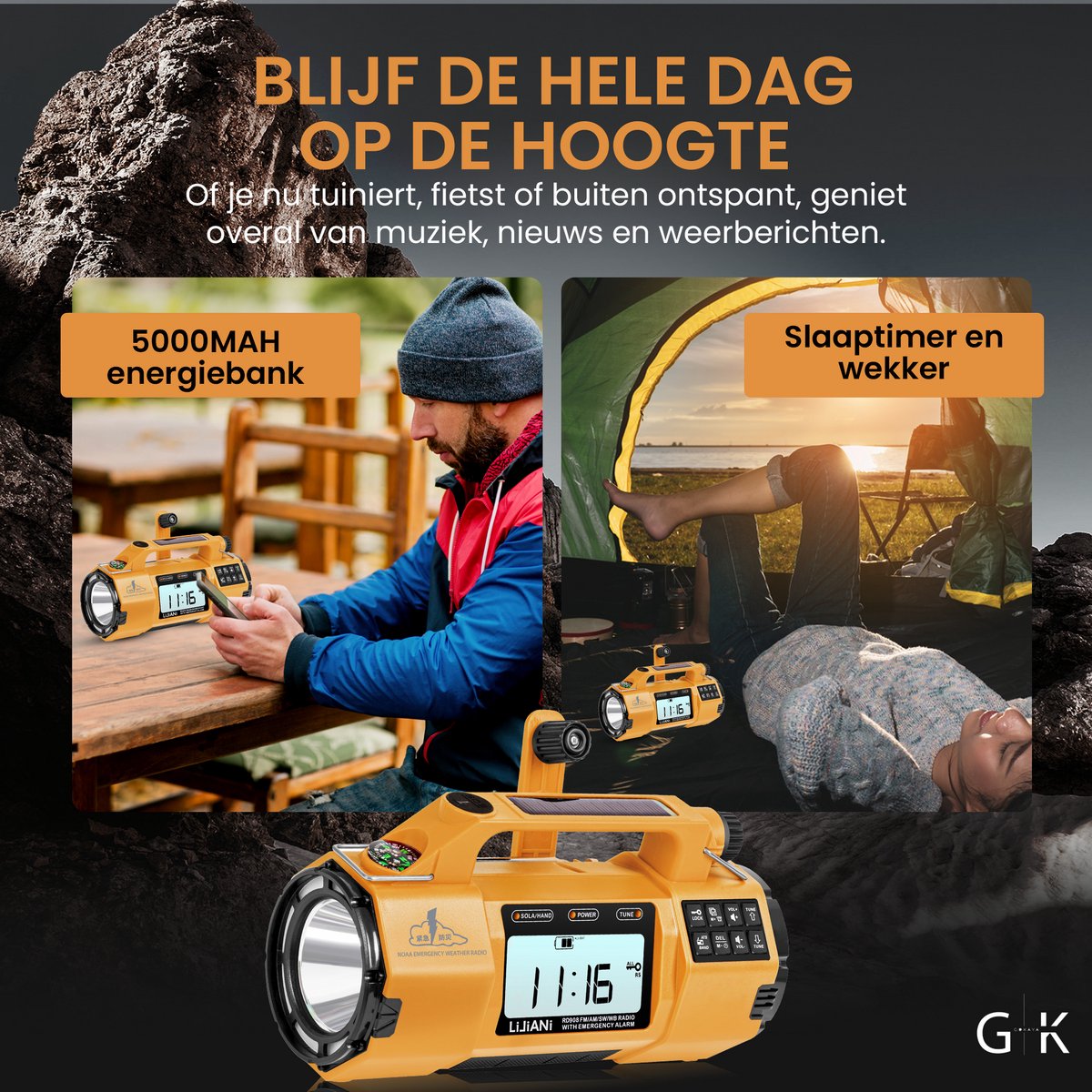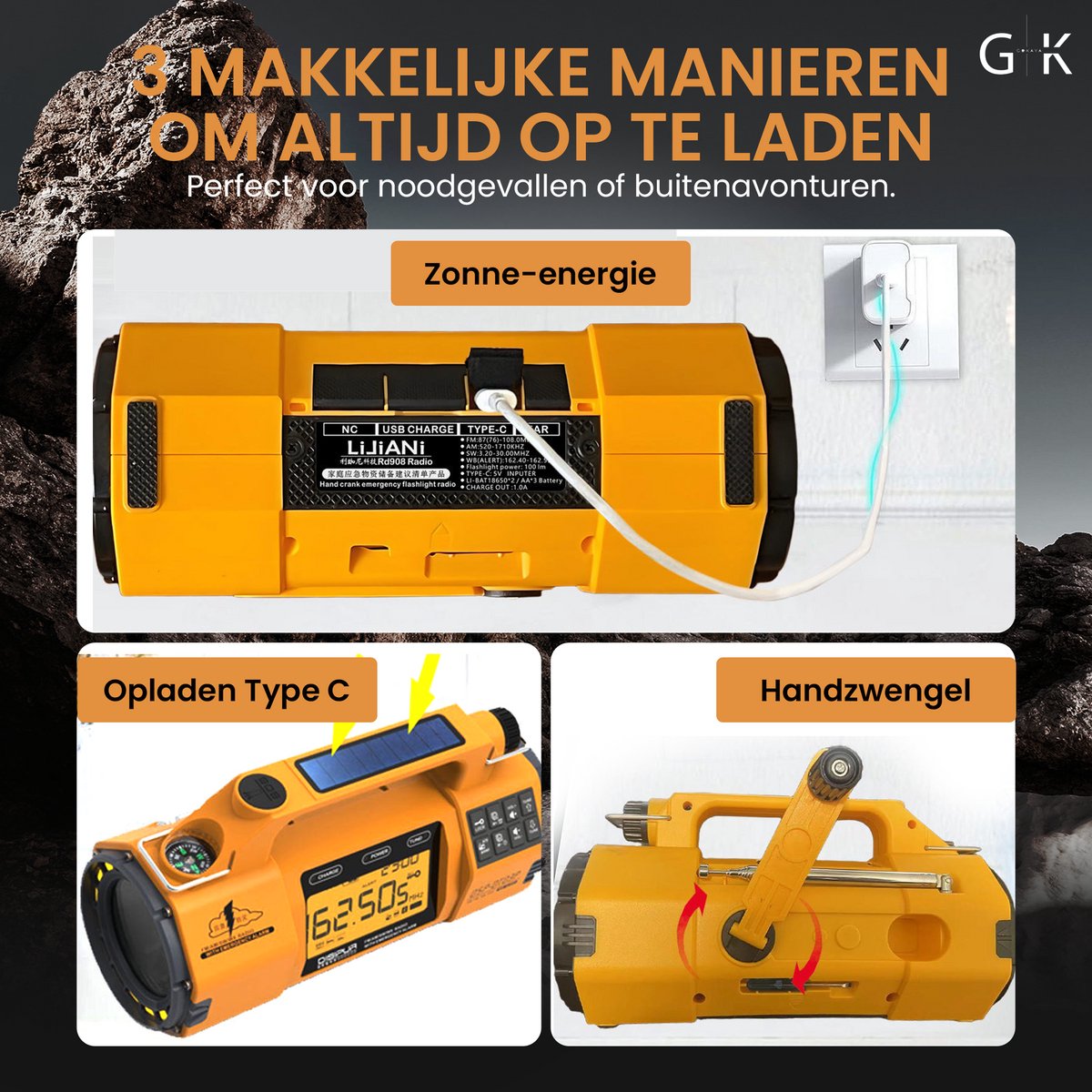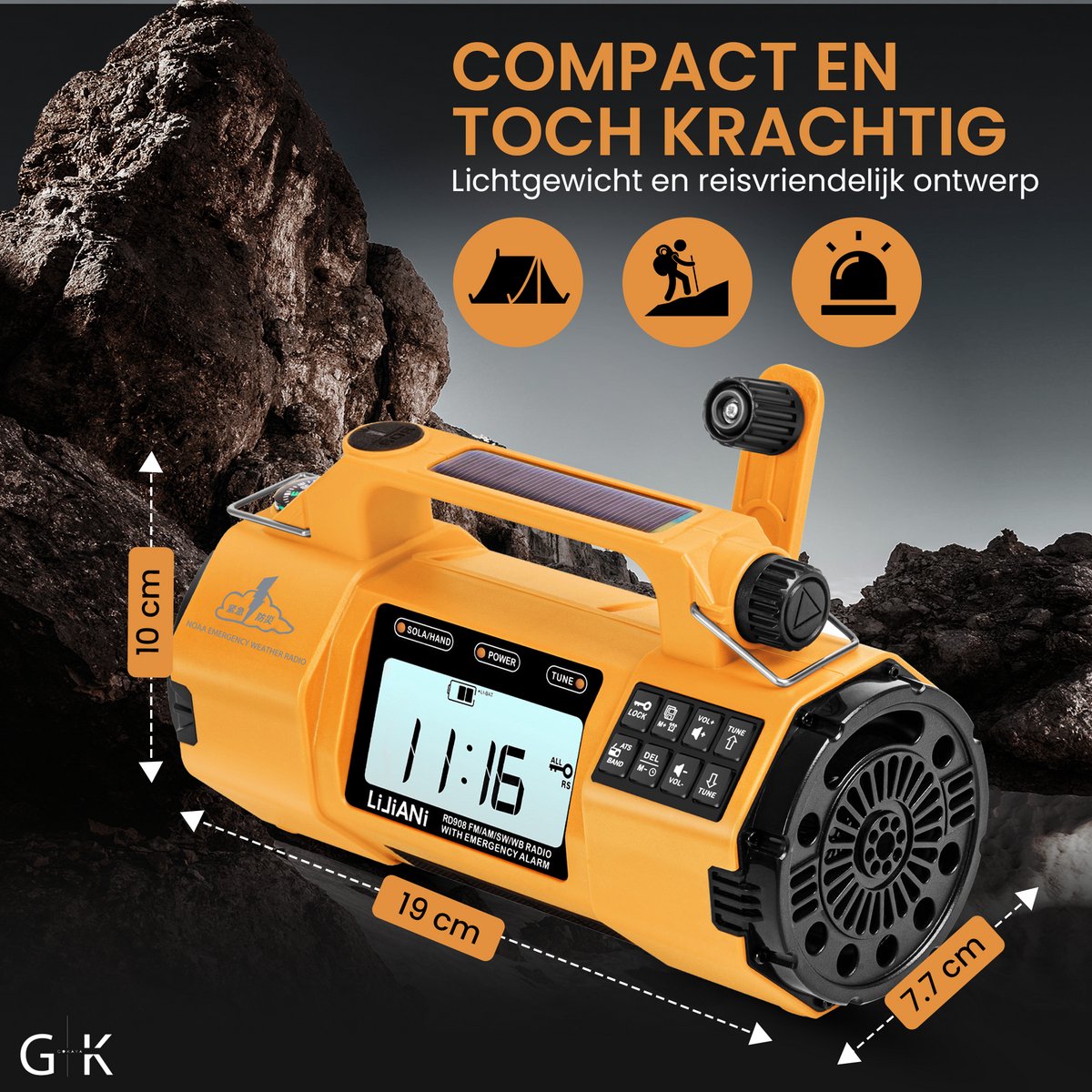 Overzicht: Deze noodradio is een compacte noodvoorziening voor Nederlandse huishoudens die zich willen voorbereiden op stroomstoringen en extreem weer. De radio heeft een ingebouwde accu van 5000 mAh waarmee je mobiele apparaten kunt opladen tijdens noodsituaties.