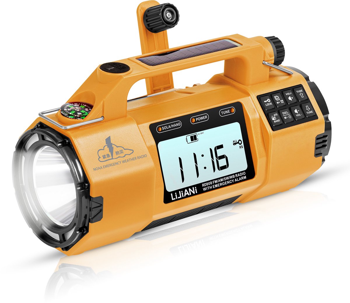 Deze noodradio 5000mAh is een compacte, multifunctionele noodvoorziening die ontworpen is om je tijdens stroomuitval, buitenactiviteiten en noodgevallen van informatie, licht en extra energie te voorzien. Hij combineert AM/FM-radio met een weerband, meerdere oplaadopties, een heldere LED-zaklamp en een SOS-alarm in één draagbaar toestel.