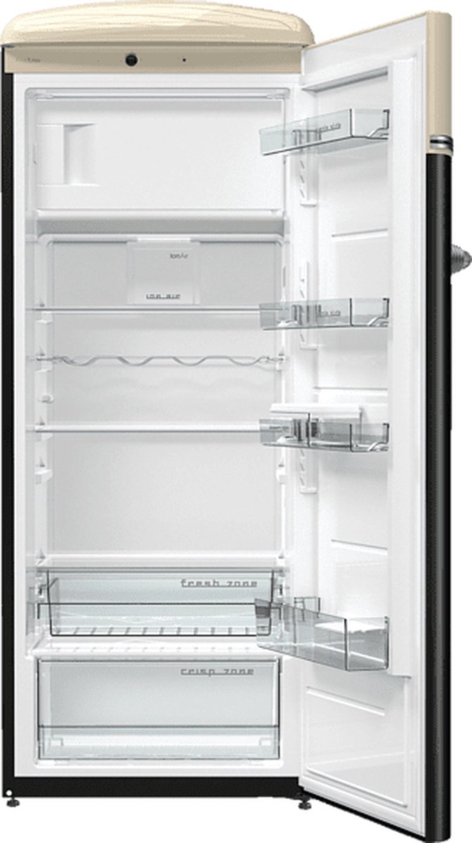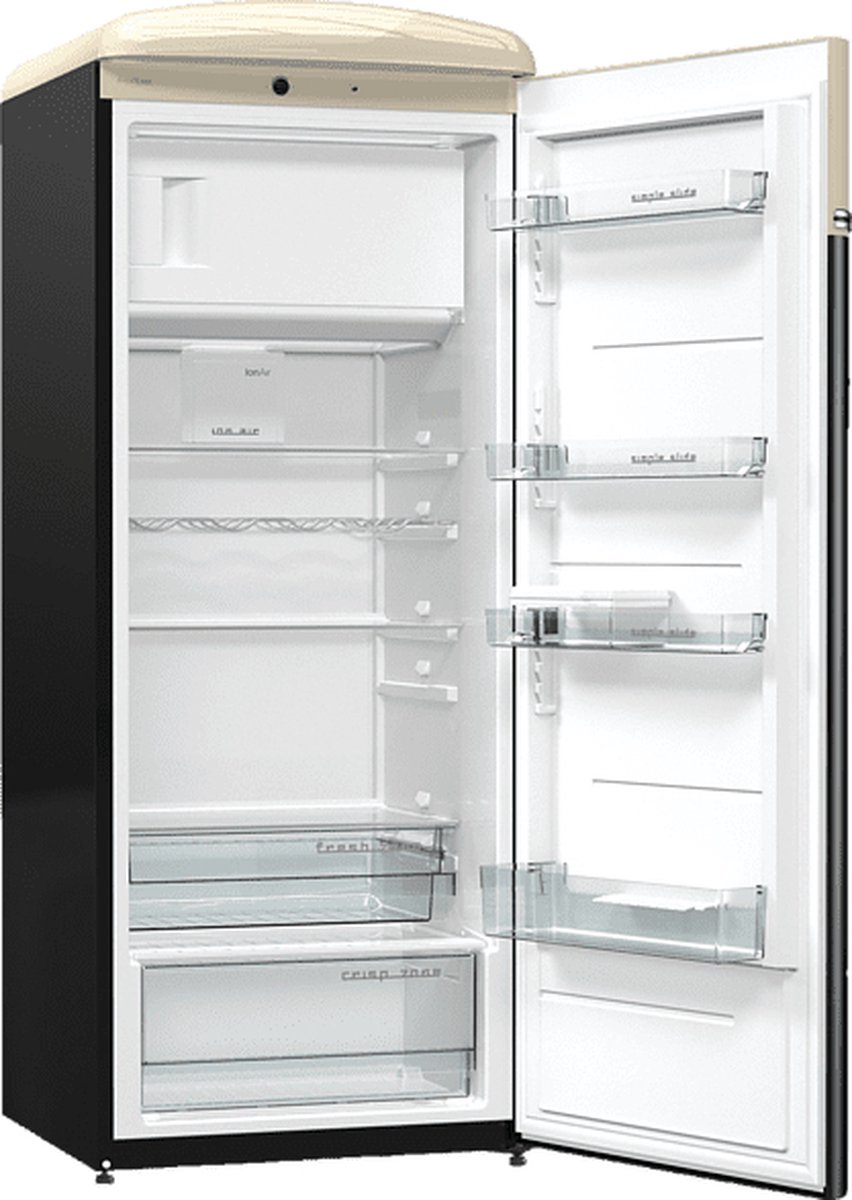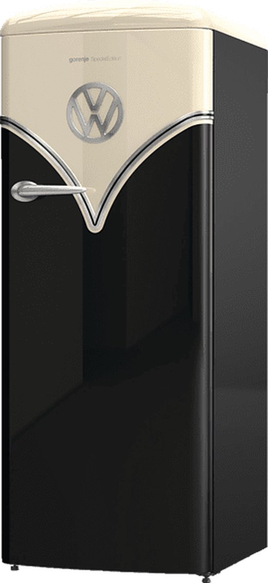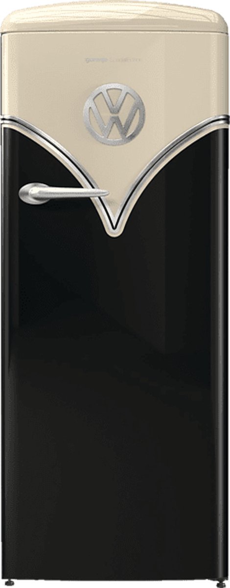 Deze koelkast is er voor liefhebbers van karakter in de keuken, kleine tot middelgrote huishoudens en iedereen die betrouwbaarheid en overzicht belangrijk vindt. De tweekleurige afwerking (zwart met roomwit), afgeronde vormen en chroomaccenten zijn ontwikkeld in samenwerking met Volkswagen, terwijl Gorenje het apparaat vult met praktische details zoals SimpleSlide-deurvakken, LED-verlichting en verstelbare veiligheidsglasplateaus.