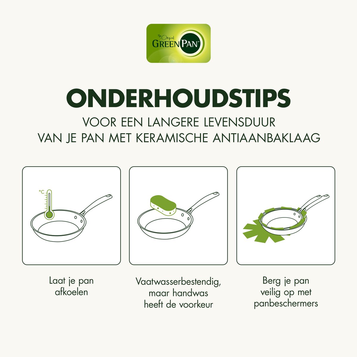 Schoonmaken is doorgaans weinig werk. Laat de pan iets afkoelen, veeg voedselresten weg met keukenpapier en spoel af met warm water en een druppel afwasmiddel. Een zachte spons is voldoende. Hardnekkige restjes? Laat even weken in warm water met een beetje afwasmiddel en veeg daarna schoon. Zo blijft de laag langer op z’n best. De fabrikant vermeldt dat de pannen in de vaatwasser mogen, maar beveelt handwas aan. Dat is consistent met het behoud van antiaanbaklagen in het algemeen: zachtere reiniging verlengt de prettige eigenschappen.