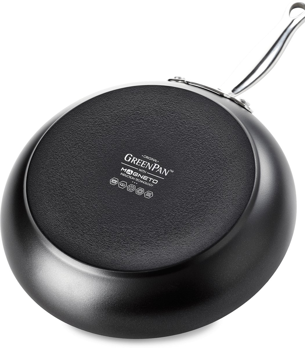 De pan bevat een Magneto-inductiebodem die zorgt voor efficiënte warmteoverdracht op gas, keramisch, halogeen en inductie. Dat betekent snellere opwarmtijd en betere controle over de temperatuur, wat vooral helpt bij het snel dichtschroeien van vlees en het zachtjes sudderen van sausjes.