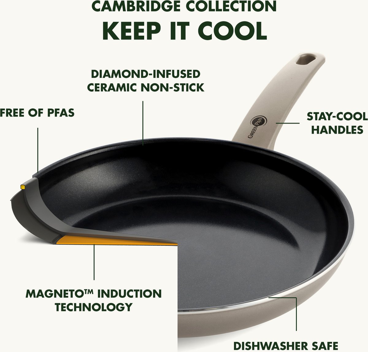 Overzicht:De GreenPan Cambridge Bronz is een PFAS‑vrije keramische koekenpan, perfect voor Nederlandse thuiskoks die gezond willen koken. De pan heeft een Thermolon™ Infinity anti-aanbaklaag versterkt met diamant en is ovenbestendig tot 160°C voor veelzijdig gebruik.