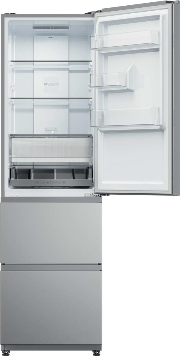 De Haier HTR3518ENMX is een vrijstaande koel-vriescombinatie uit de 3D 55 Serie 3 met een breedte van slechts 55 cm, uitgevoerd in roestvrijstaal-look. Hij combineert een royale inhoud (303 liter) met slimme bewaartechiek, zoals Air Surround, My Zone en volledig No Frost in zowel koel- als vriesgedeelte (bron: listing, gecontroleerd 2025).