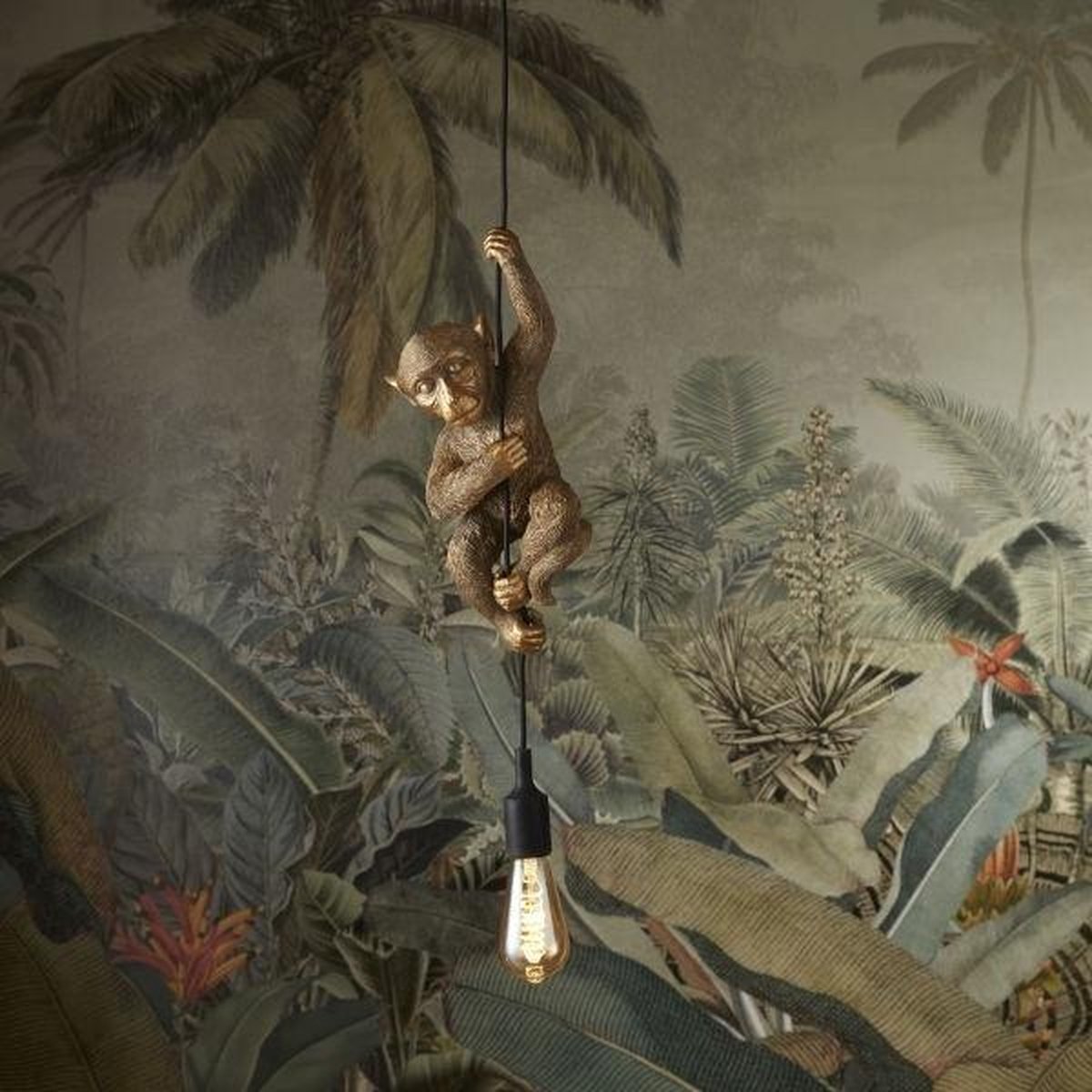 Dit product is een decoratief lampobject: een klein, goudkleurig aapje dat speels aan je hanglamp hangt. Het combineert een beeldsculptuur met een praktische lampfunctie, maar wordt verkocht zonder lichtbron (exclusief bulb). De materiaalomschrijving noemt polyresin, en de afmetingen zijn H 39 cm / B 15 cm / D 13 cm (bron: listing, checked 2025).