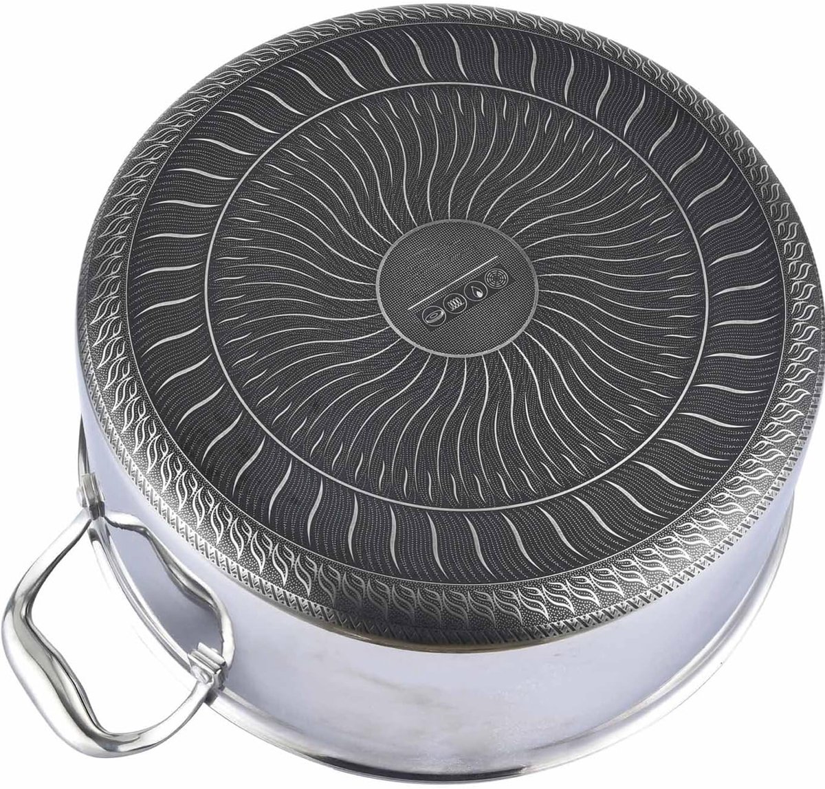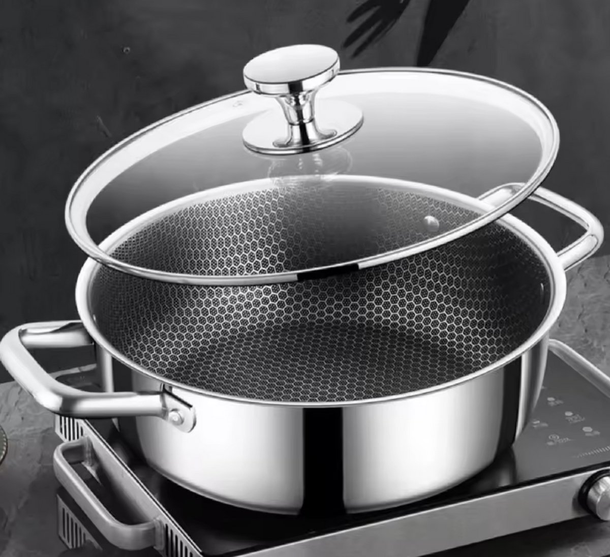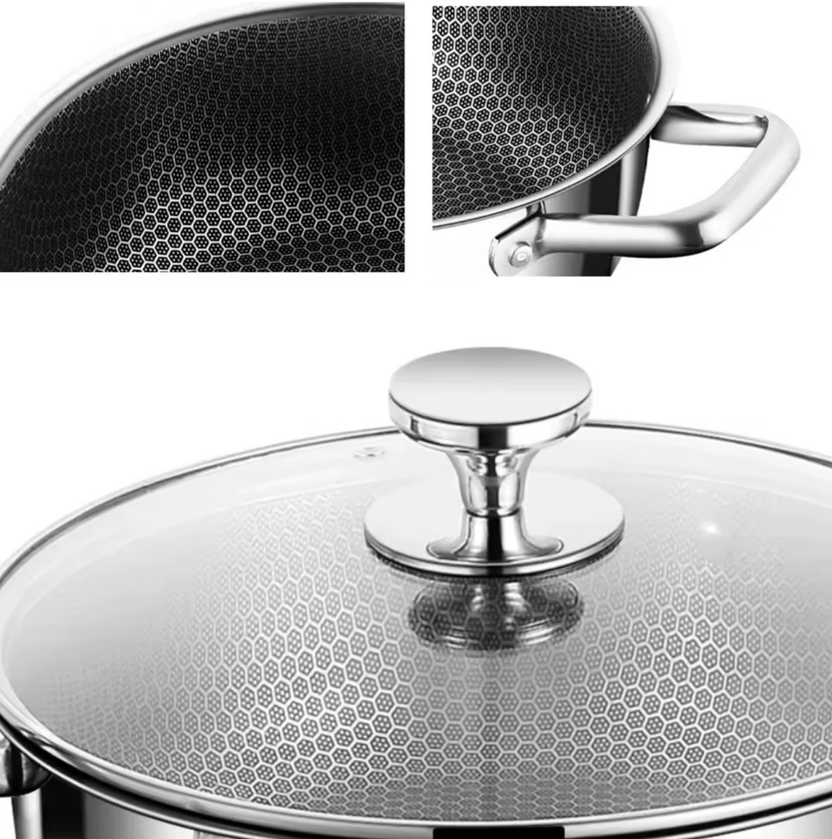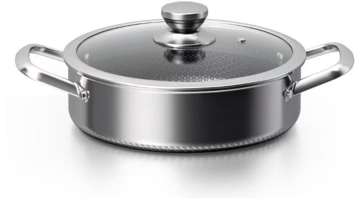 Dit is een ruime, robuuste RVS hapjespan met glazen deksel die ontworpen is voor wie moeiteloos voor meerdere eters wil koken. De pan combineert een 3-laagse opbouw (roestvrij staal – aluminium kern – roestvrij staal) met een moderne honingraatstructuur aan de binnenzijde. Het resultaat is een snelle, gelijkmatige warmteverdeling en een goed controleerbare bakervaring zonder hinderlijk aanbakken.