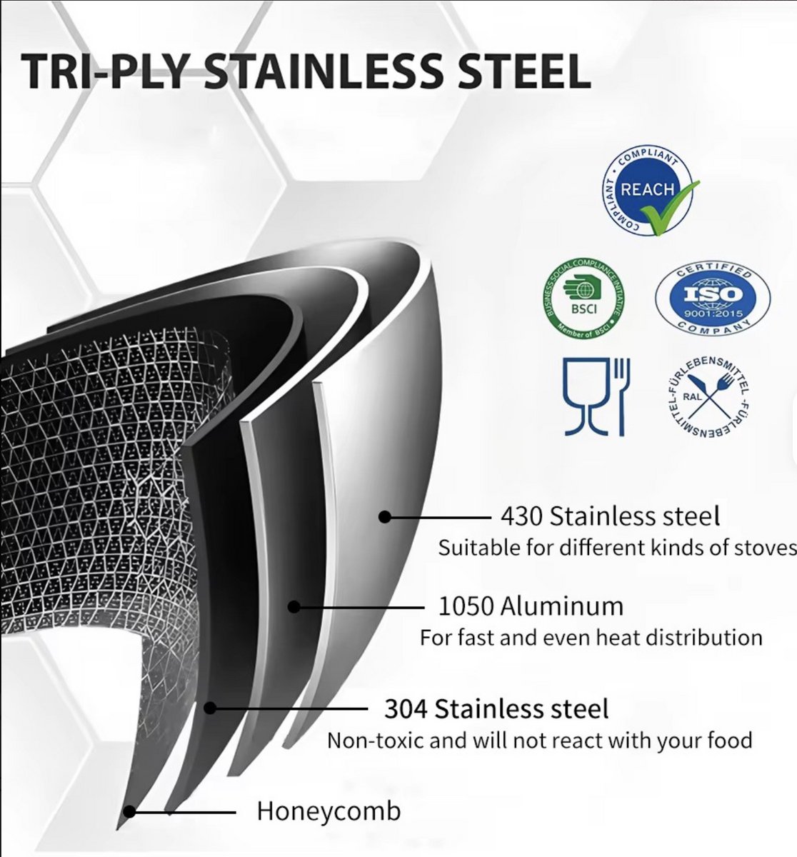 | Constructie | 3-ply: roestvrij staal – aluminium kern – roestvrij staal |