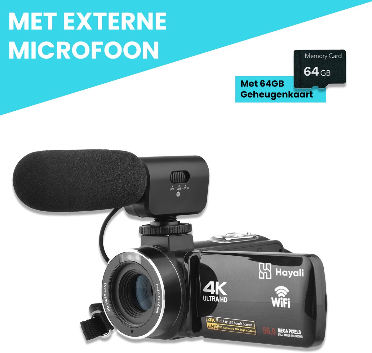 Overzicht:De HAYALI® 4K videocamera is een complete 2-in-1 set voor Nederlandse vloggers en reizigers die professionele beelden willen maken. De set bevat een 64 gigabyte geheugenkaart en externe microfoon, en levert 4K-video plus 56 megapixel foto’s voor haarscherpe resultaten.