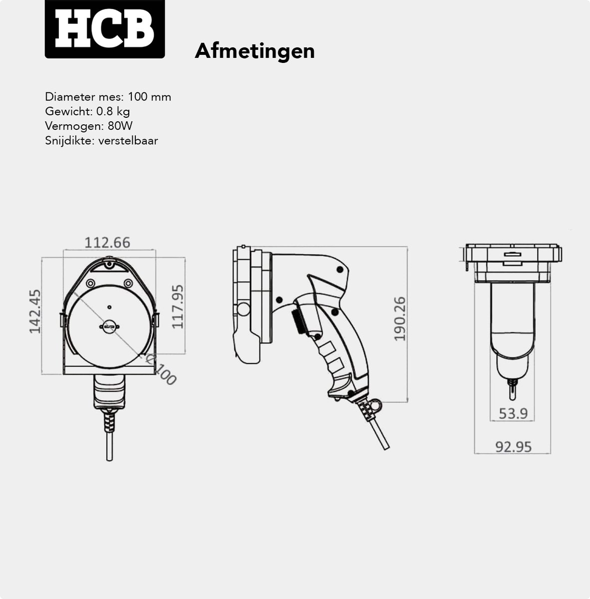 Qua uitstraling is het apparaat overwegend zwart, met functioneel ontwerp boven franje. Er is geen antislipbodem, maar dat is logisch: dit is een handtool, geen stationair apparaat. De aansluitwaarde is 230 V en het opgenomen vermogen is door de fabrikant opgegeven als 80 watt. Voor deze categorie is dat toereikend voor dun, gelijkmatig snijden, mits je met het mes rustig en gecontroleerd werkt. De meegeleverde slijpsteen en reserve V‑snaar onderstrepen dat er is nagedacht over langdurig, intensief gebruik en gemakkelijk onderhoud.