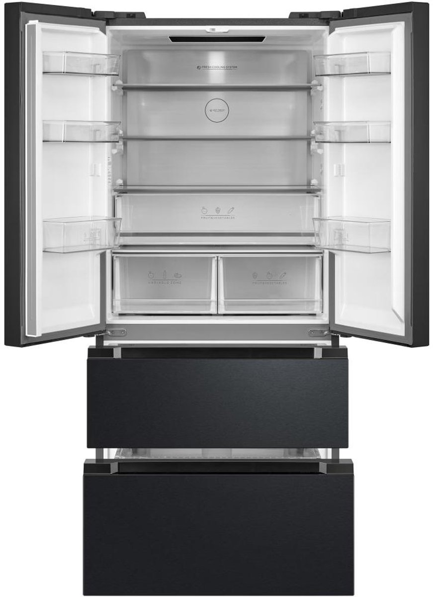 De Heinner French Door 516 L No Frost kiest voor een donker inox afwerking die naadloos past in moderne keukens en mooi combineert met roestvrijstalen of zwarte apparatuur. De uitstraling is strak en tijdloos, terwijl de brede dubbele deuren boven extra ergonomie bieden: je opent precies het deel dat je nodig hebt en behoudt beter de koude lucht. De twee vriesladen onderin schuiven soepel naar buiten, waardoor je geen “diepe vrieskist” hoeft uit te mesten maar direct overzicht houdt.