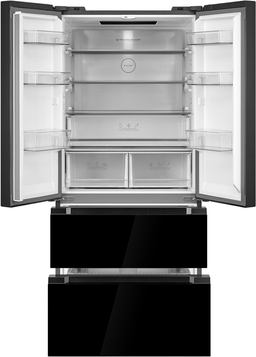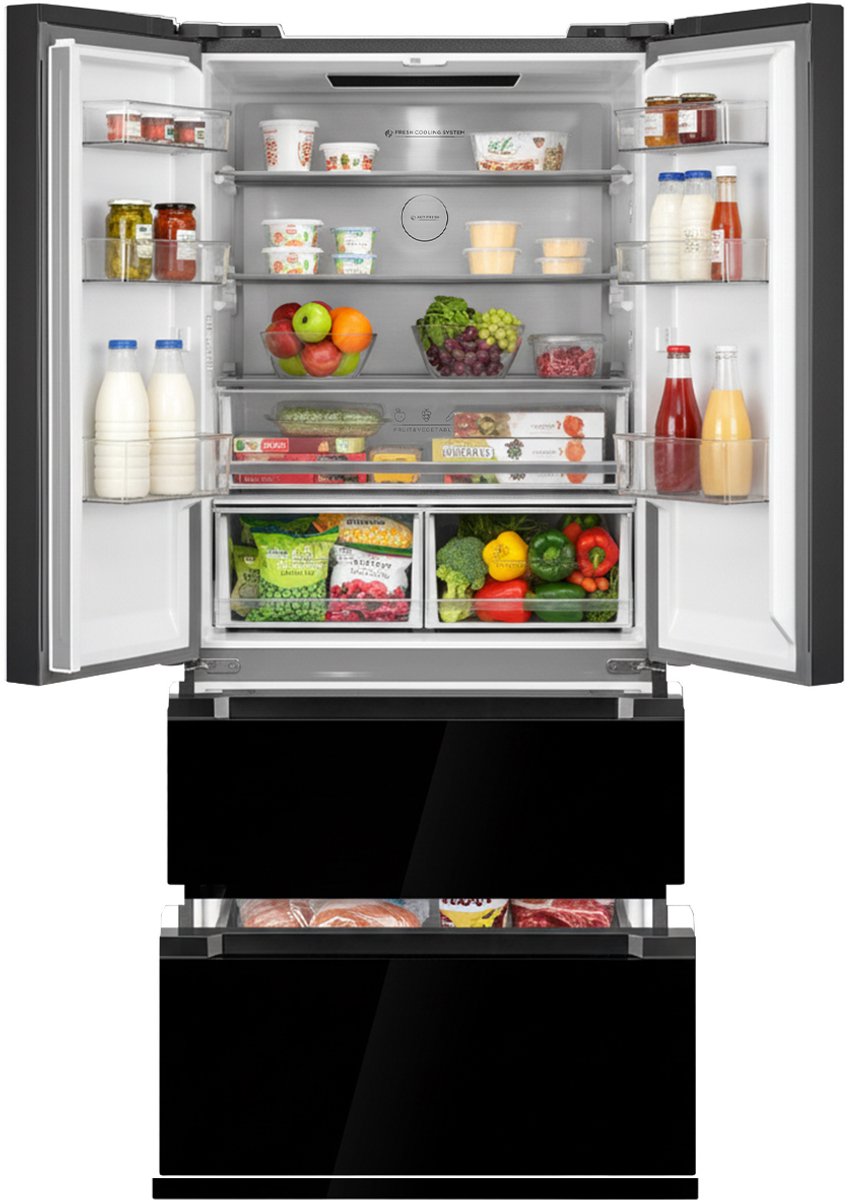 Twee bovenste deuren geven brede toegang tot de koelruimte, wat ideaal is voor grote schalen en brede ovenschotels. De vriesladen onderin maken sorteren eenvoudig: denk aan brood en fruit in de ene lade, vlees en vis in een andere. Je trekt de lade open en ziet direct waar je wat hebt — zonder dat er koude verdwijnt door een volledig geopende vriesdeur.
