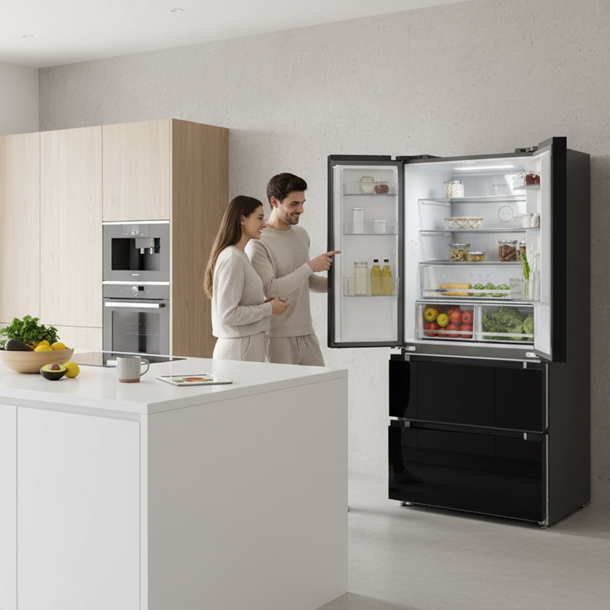 De afwerking oogt premium en praktisch. De LED-verlichting is helder en gelijkmatig, waardoor ook de onderste schappen zichtbaar blijven. Het bedieningspaneel is een duidelijk LED-touchdisplay. Daarmee stel je eenvoudig de temperatuur in en activeer je snelle functies, zoals snelkoelen of -vriezen voor als je veel boodschappen in één keer inruimt. Dankzij slimme ventilatie verdeelt de koelkast de koude lucht gelijkmatig, wat helpt om temperatuurverschillen tussen schappen te beperken.