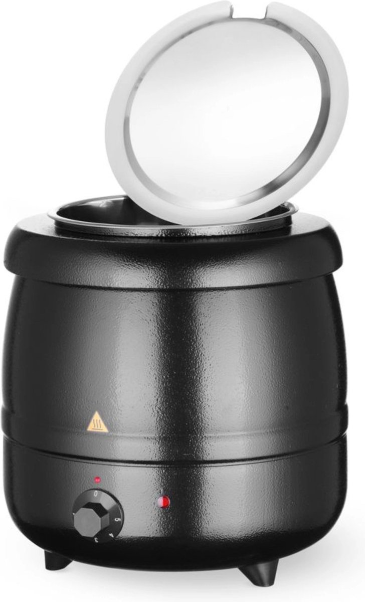 De HENDI soepketel heeft een metalen buitenbehuizing met zwarte poedercoating, wat zorgt voor een professioneel en onderhoudsvriendelijk uiterlijk. De soepcontainer en het deksel zijn gemaakt van roestvast staal AISI 201, wat resistent is tegen corrosie en gemakkelijk te reinigen is — ideaal voor intensief gebruik in horeca en buffetopstellingen (roestvast staal).