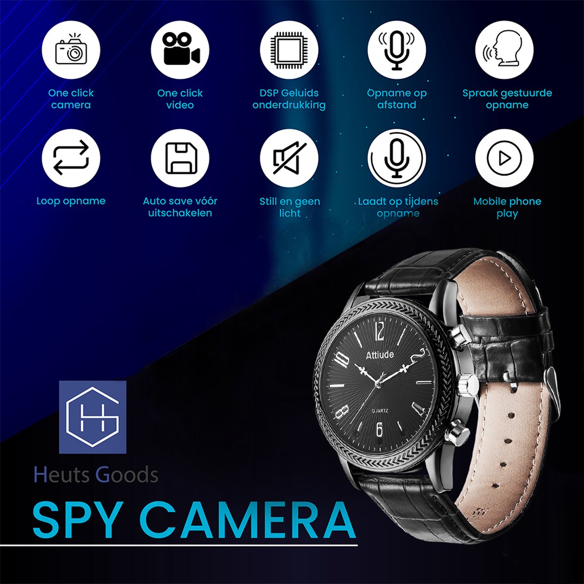 Het Heuts Goods horloge met verborgen camera is een stijlvol polshorloge met een geïntegreerde, discrete camera en opnamefuncties. Het combineert tijdweergave met mogelijkheden om video, foto’s en geluidsopnames te maken, en is ontworpen voor situaties waarin je op een onopvallende manier beelden moet vastleggen.