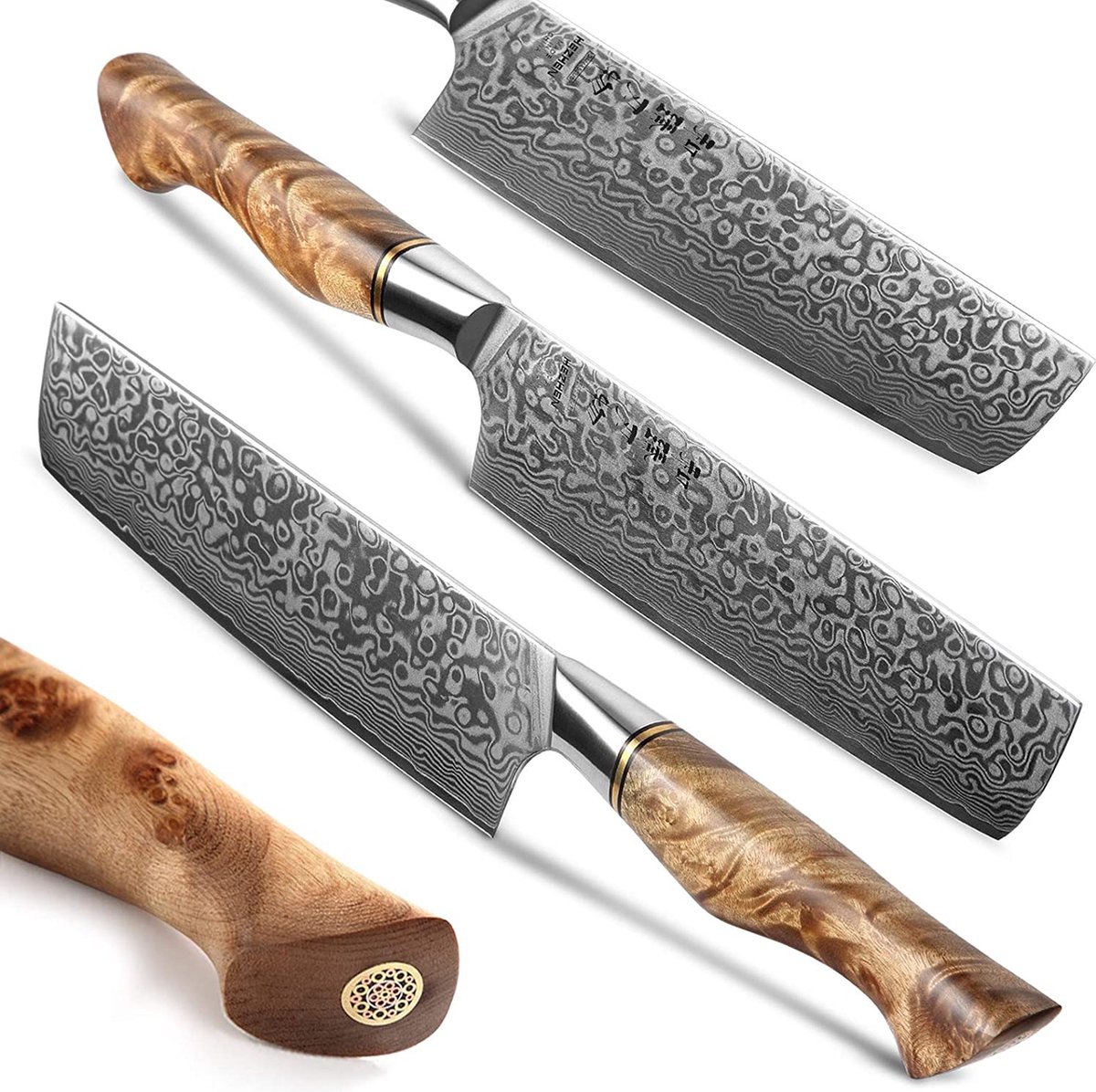 - Ervaar gebalanceerde grip met plataanhouten handvat en mozaïek-klinknagel.