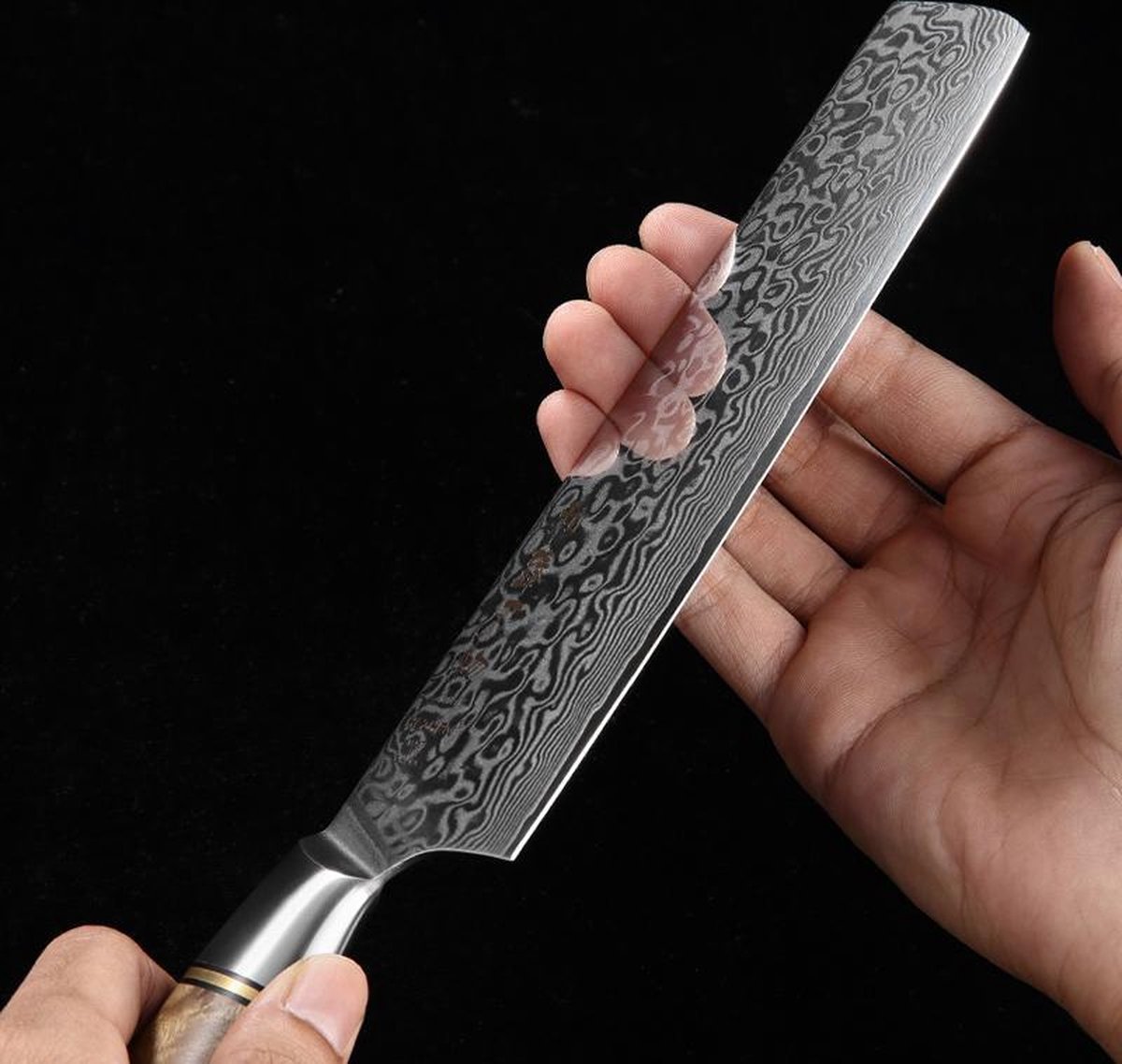 Het staal is gelaagd met een zichtbaar patroon dat het oppervlak niet alleen siert maar ook de hoogwaardige opbouw verraadt. Binnenin zit een harde kern die de scherpte lang vasthoudt, daaromheen meerdere lagen die sterkte en bescherming geven. Volgens de productbeschrijving is het mes grotendeels op traditionele wijze met de hand gesmeed en gehamerd; dat zie je terug in het subtiele, ambachtelijke reliëf en de egale overgang van rug naar snede.