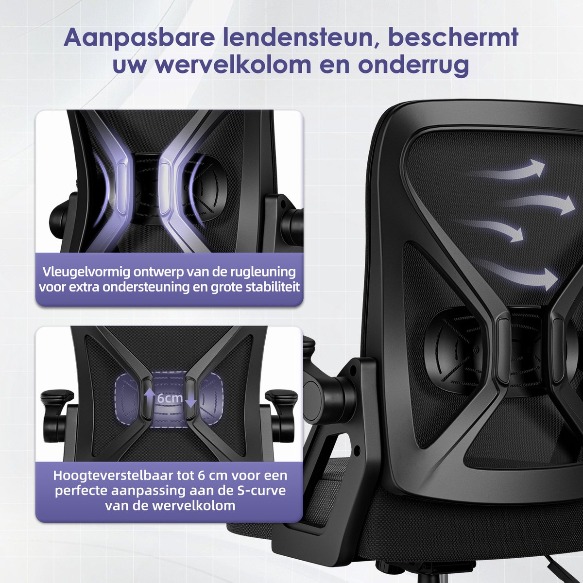 - Ondersteun de onderrug met 6 cm verstelbare lendensteun voor minder vermoeidheid.