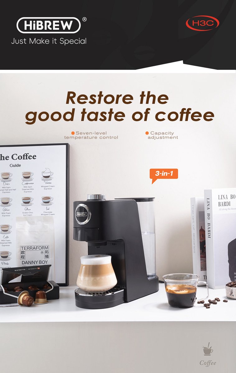 De HiBREW H3C is een compact, veelzijdig koffiemachine dat capsules van Nespresso Original en Dolce Gusto combineert met de mogelijkheid om gemalen koffie te gebruiken. Het apparaat richt zich op huishoudens en kleine kantoren die variatie willen zonder meerdere apparaten op het aanrecht.