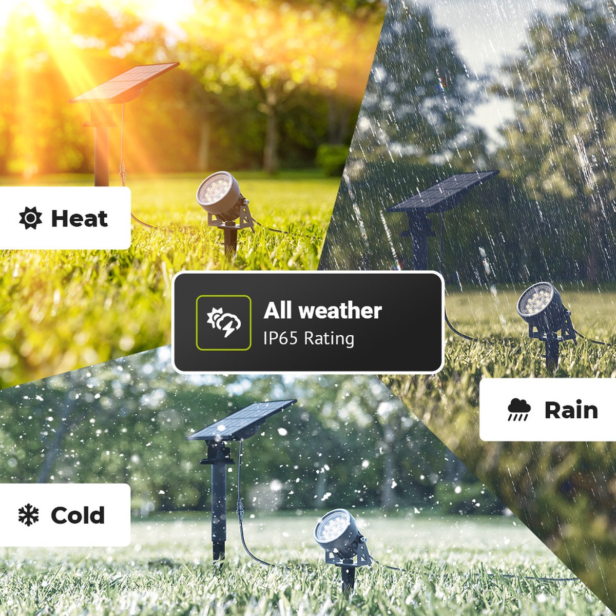 - Weersta regen en sneeuw met IP65-bescherming tegen water en stof.