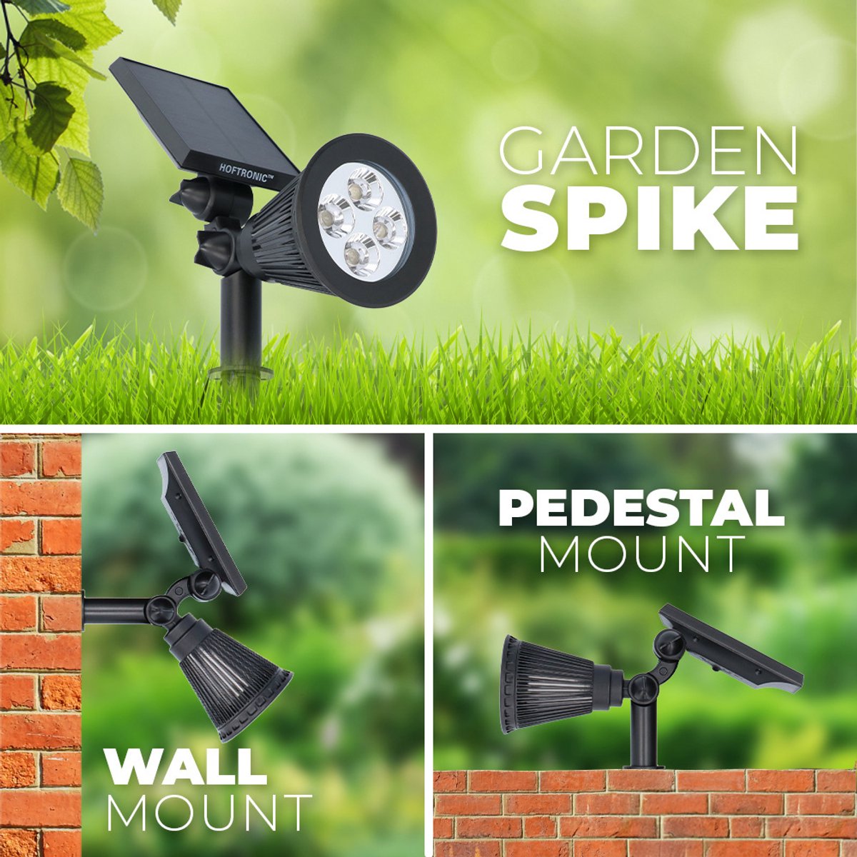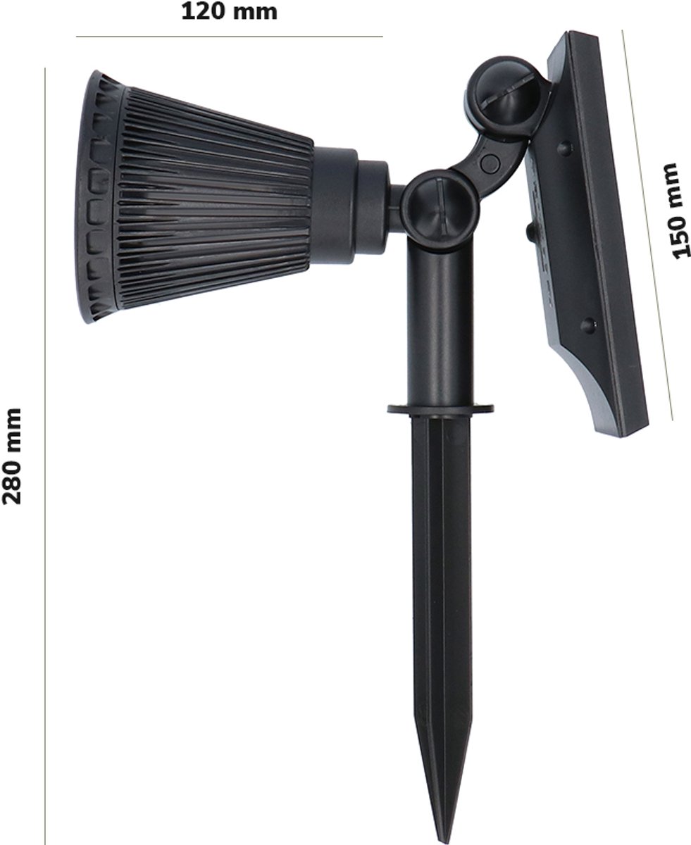 - Installatie in 5 stappen1) Kies de plek: bij voorkeur zuidgericht, met minstens enkele uren direct zonlicht tussen 11:00–15:00.2) Bepaal de functie: accent (bijv. boom) of oriëntatie (bijv. pad). Zet voor accent de spot dichter bij het object (0,5–1,5 m), voor oriëntatie iets verder.3) Plaatsing: prik de spies stabiel in stevige grond of bevestig aan de wand. Zorg dat het zonnepaneel vrij zicht heeft.4) Kantelen: richt de spot en draai het paneel naar de zon. In de zomer mag het paneel iets vlakker, in de winter steiler.5) Modus kiezen: druk op de knop onder het paneel om te wisselen tussen 100 en 200 lumen.
