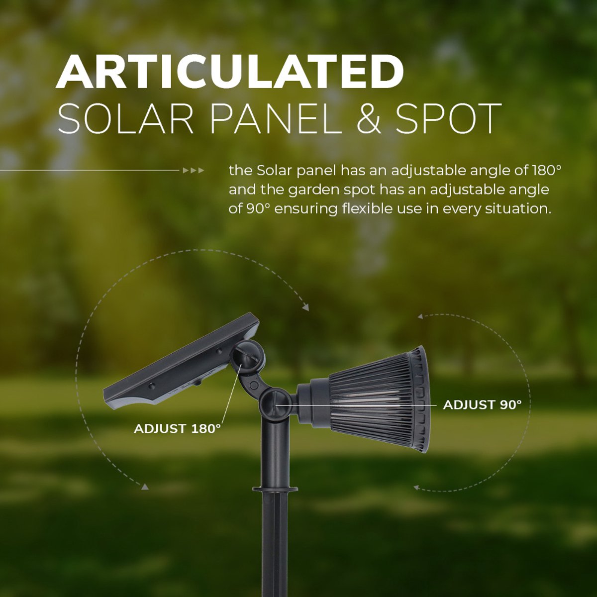 De spot kantelt 90 graden en het paneel 180 graden. Daarmee ontkoppel je licht en laadhoek. Je verlicht bijvoorbeeld een boom kruin omhoog, terwijl je het paneel plat of juist schuin naar de zon draait. Vooral bij wandmontage is dit goud waard: een verticale wand krijgt niet altijd optimale zon; door het paneel te kantelen compenseer je dat gedeeltelijk.