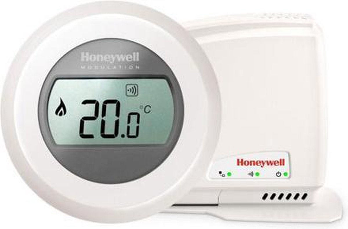 De Honeywell Round Connected Modulation (Y87C2004) is een modulerende, bedrade kamerthermostaat voor OpenTherm cv-ketels en warmtepompen, geleverd met de internet‑gateway RFG100. Je bedient en programmeert de verwarming via een duidelijke ronde thermostaat aan de wand én op afstand met de Total Connect Comfort‑app op je telefoon of tablet.