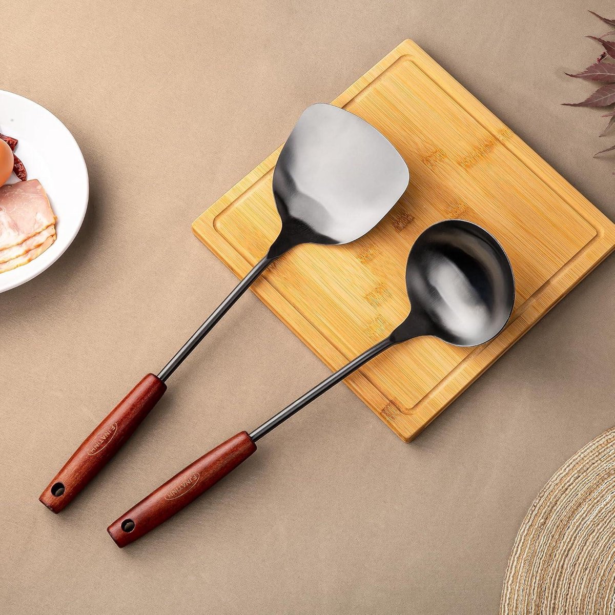 Overzicht:De Wokspatelset van hoogwaardig roestvrij staal is een praktische, duurzame keukenset voor Nederlandse thuiskoks die efficiëntie willen. De set bevat een wokspatel van 38,1 cm en massief perenhouten handvat, met titanium coating voor roestvrije prestaties.
