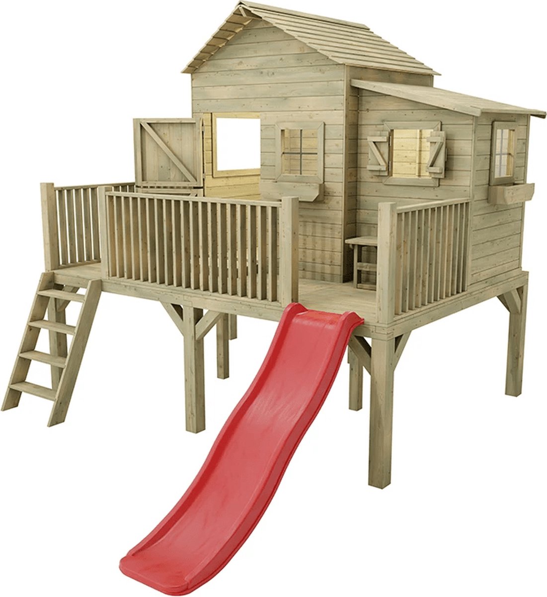 Het speelhuisje leent zich goed voor extra’s zoals een brievenbus, bel of glijbaan (deze zijn in de productafbeelding ter illustratie en niet inbegrepen). Door zelf accessoires te kiezen kun je het speelhuis volledig afstemmen op de wensen van de kinderen en de tuinstijl.