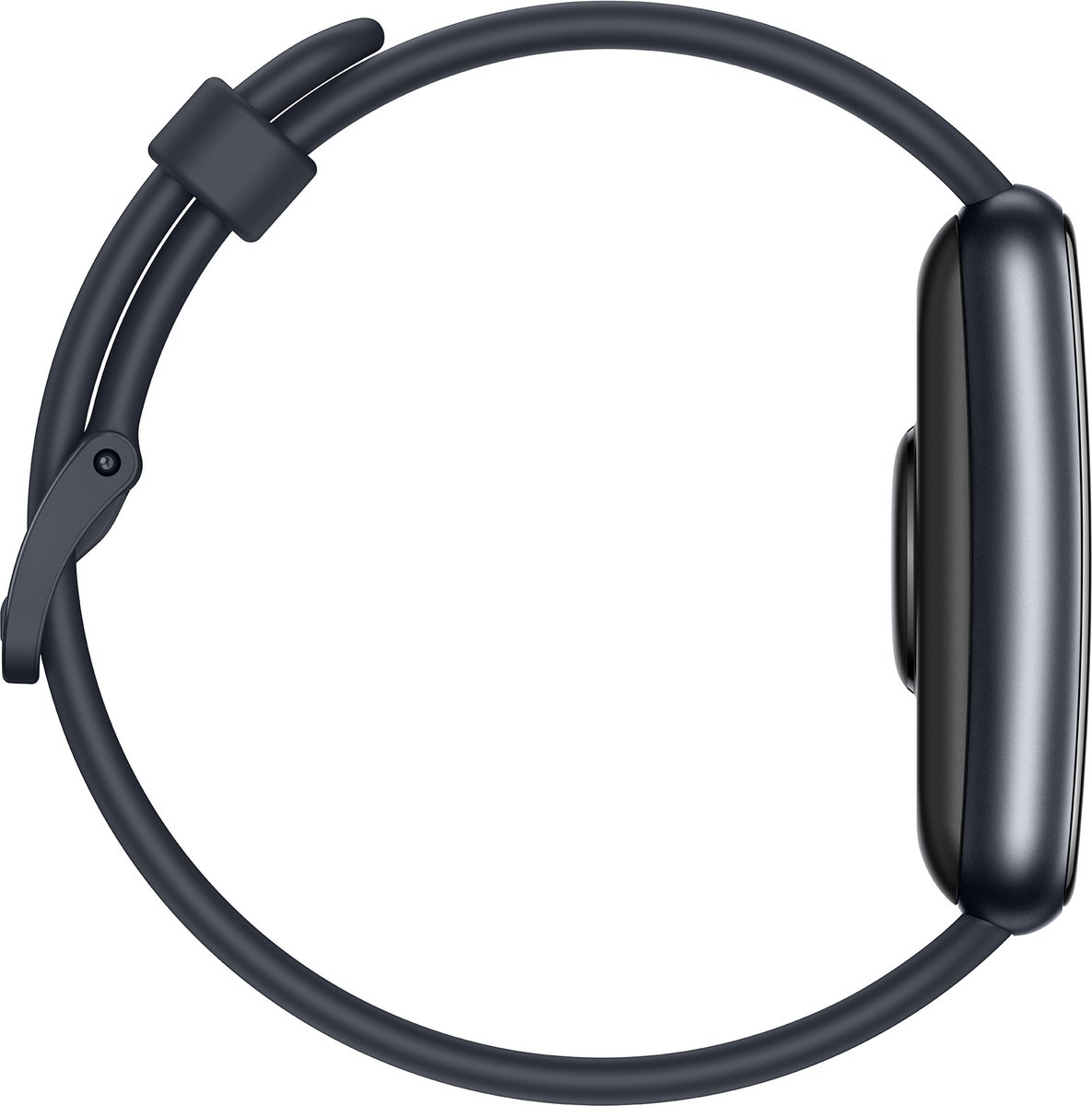 De HUAWEI WATCH FIT SE heeft een rechthoekig schermformaat met afgeronde hoeken en een 1,64-inch HD AMOLED-display — dat geeft scherpe, contrastrijke beelden en goede leesbaarheid bij verschillende lichtomstandigheden (source: listing, checked 2025). Het toestel wordt geleverd met een zwart siliconen bandje dat comfortabel aanvoelt en makkelijk te verwisselen is, zodat je het uiterlijk snel kunt aanpassen.