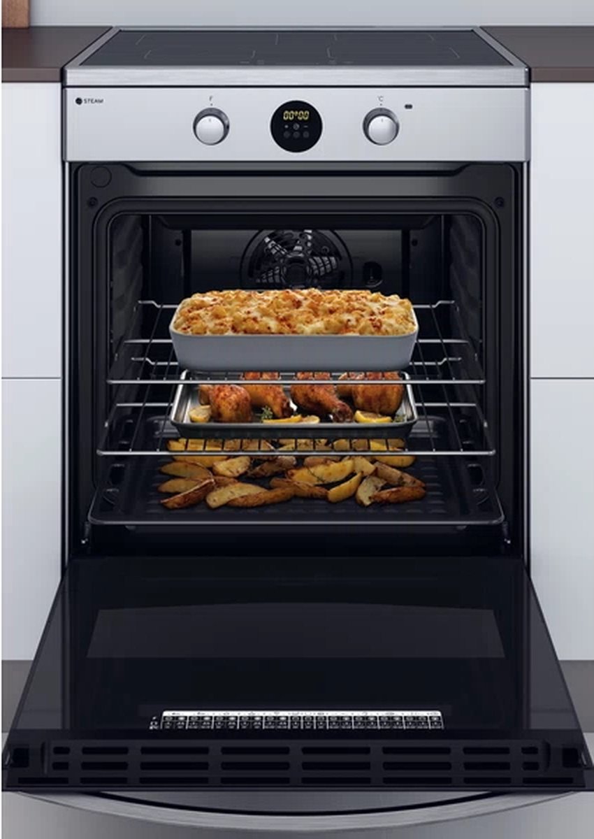 Een vrijstaand inductiefornuis met elektrische oven, perfect voor Nederlandse huishoudens die schoonmaken en koken eenvoudig willen. De Indesit IS67IQ8CCX/FR combineert 69 liter ovenruimte, vier inductiezones en handige reiniging zoals een uitneembaar glazen voorpaneel en katalytische zijpanelen.